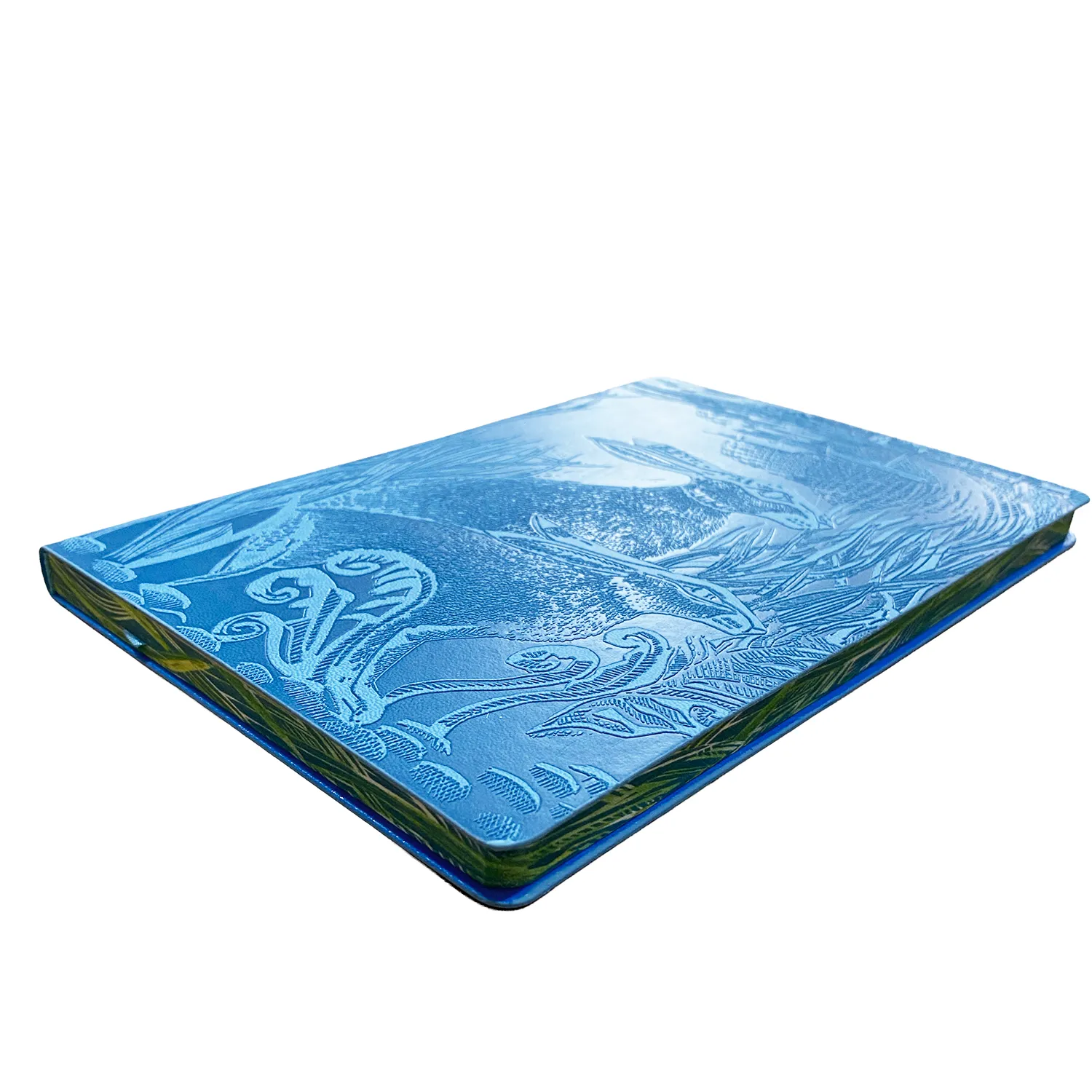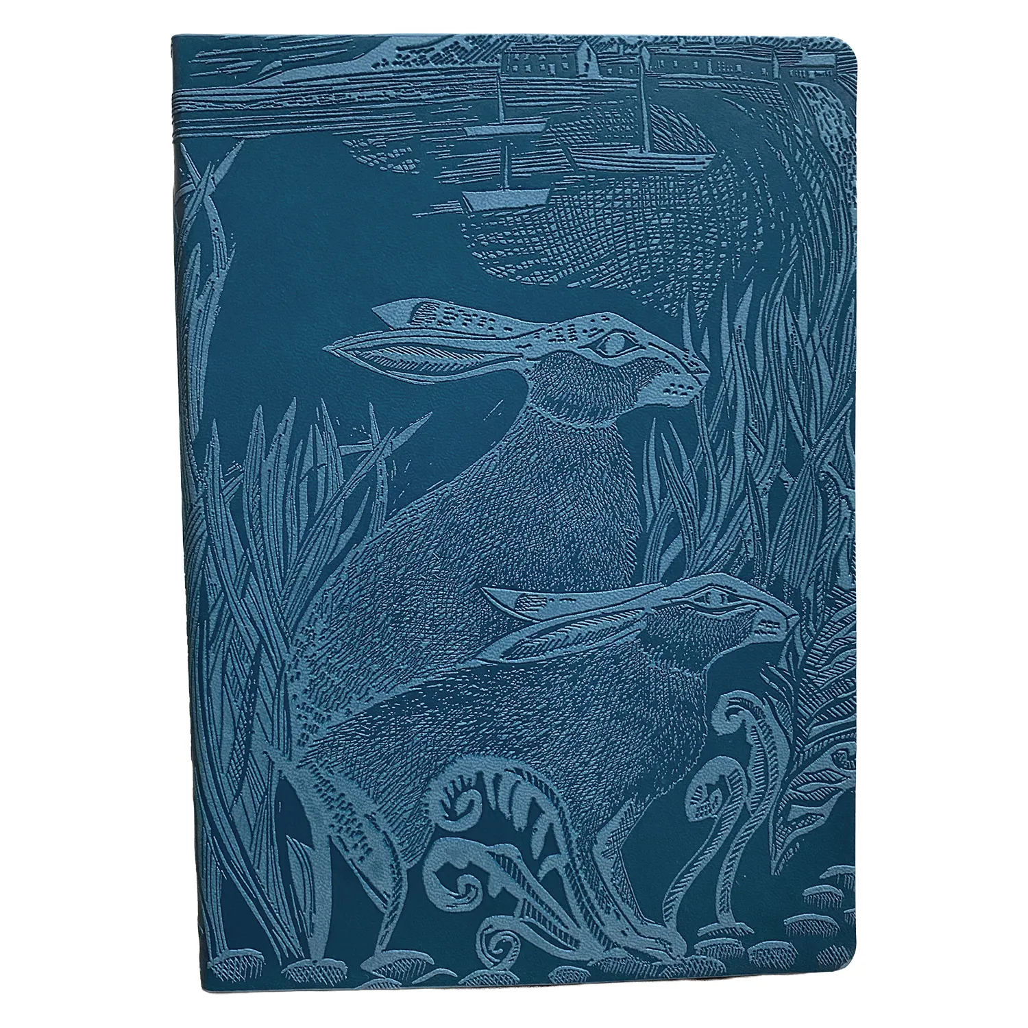 Angela Harding Rathlin hares artisan notebook. The hare design embossed on to deep blue soft covers with a coloured edge to the pages. 176 rule cream paper pages inside and a ribbon marker.