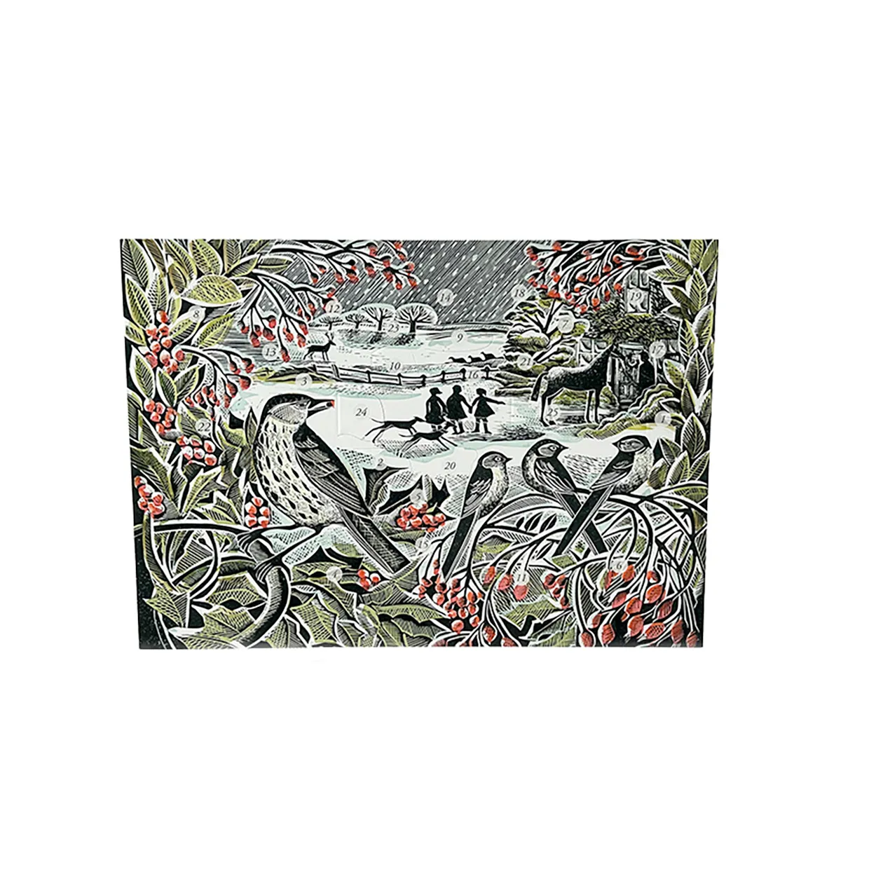Angela Harding holly hedge mini advent calendar greetings card. A seasonal Winter countryside scene with 24 little windows to open for the countdown to Christmas. Blank inside for your own Christmas wishes.
