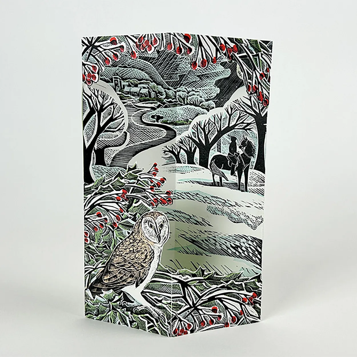 Angela Harding owl flight fold out die-cut greetings card with a winter scene of an owl in the woods overlooking a rider and pathway to a small village in the snow. Blank inside for your own seasonal greeting.