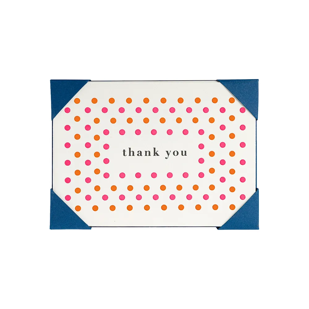 Archivist bright dots mini thank you cards. A pack of five identical note cards with pink and orange spots, supplied with envelopes in a blue card holder. Blank inside.