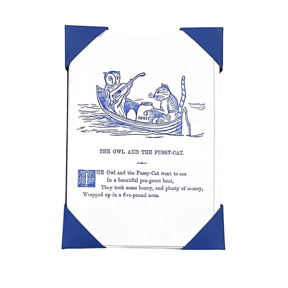 Archivist the owl and the pussy cat mini note cards featuring an illustration of the owl and cat in a boat with a verse from this much loved nursery rhyme underneath. Five cards all the same design with envelopes in card wrapper. Blank inside.