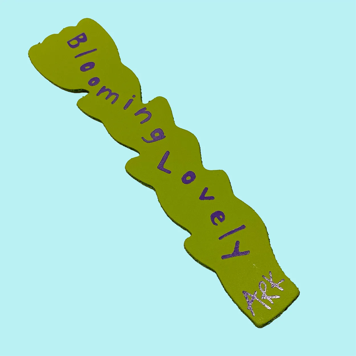 Ark tulip real leather bookmark in apple green, blue and orange. Back printed with the words blooming lovely on green.