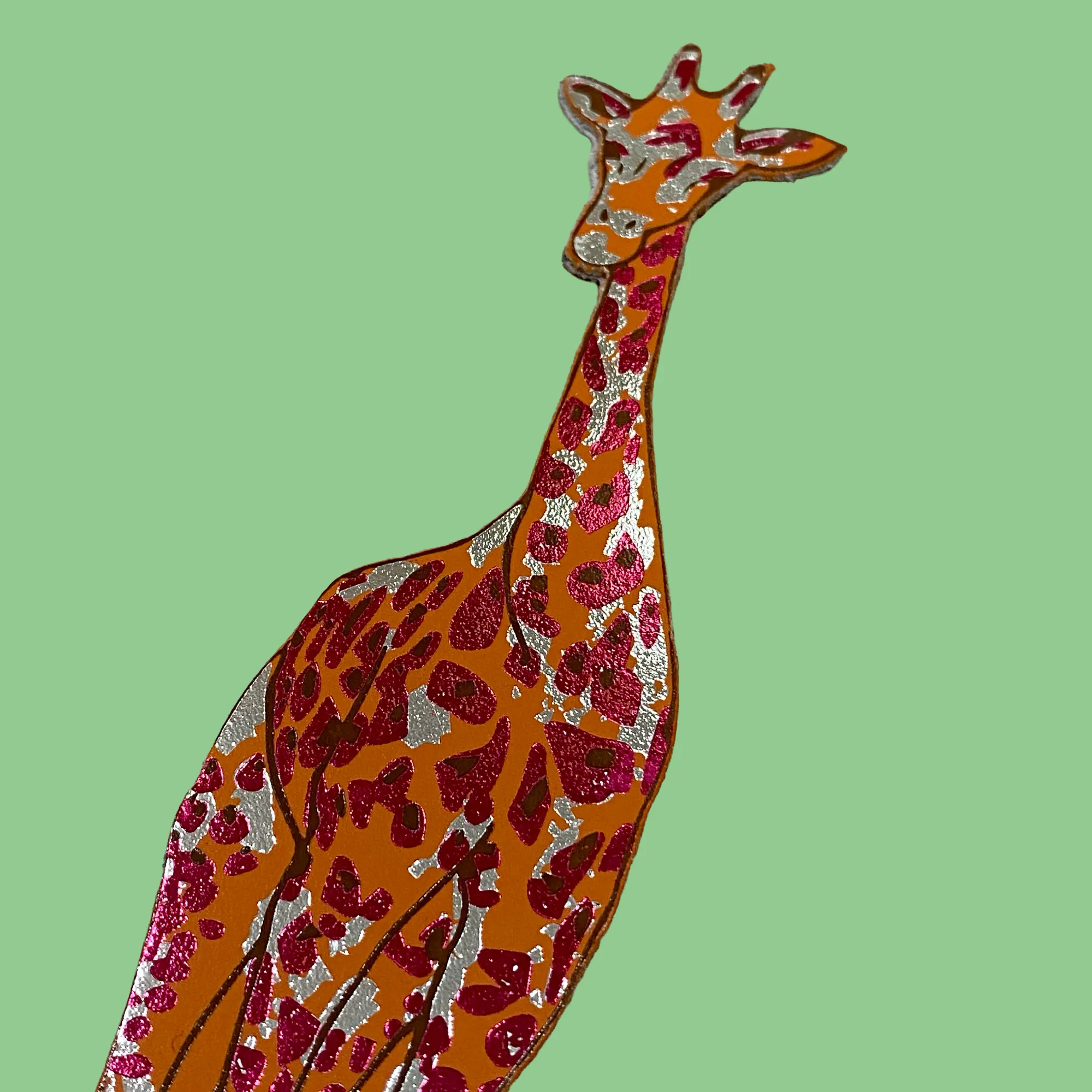 Ark giraffe leather bookmark printed in red and silver metallic on orange.