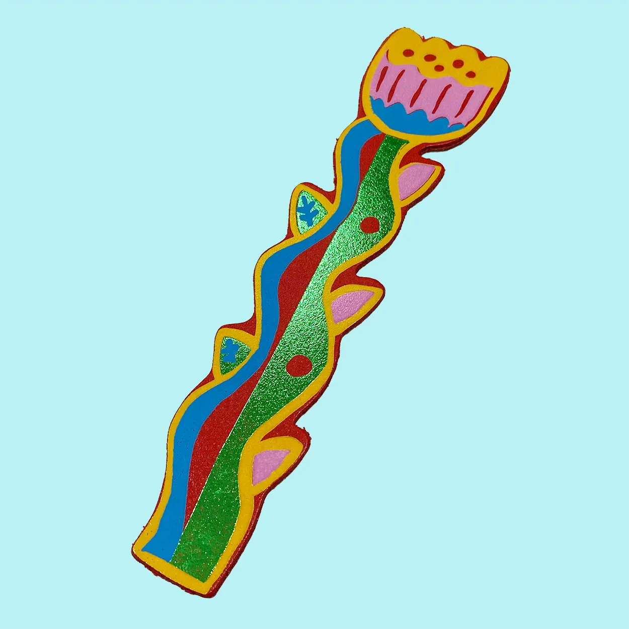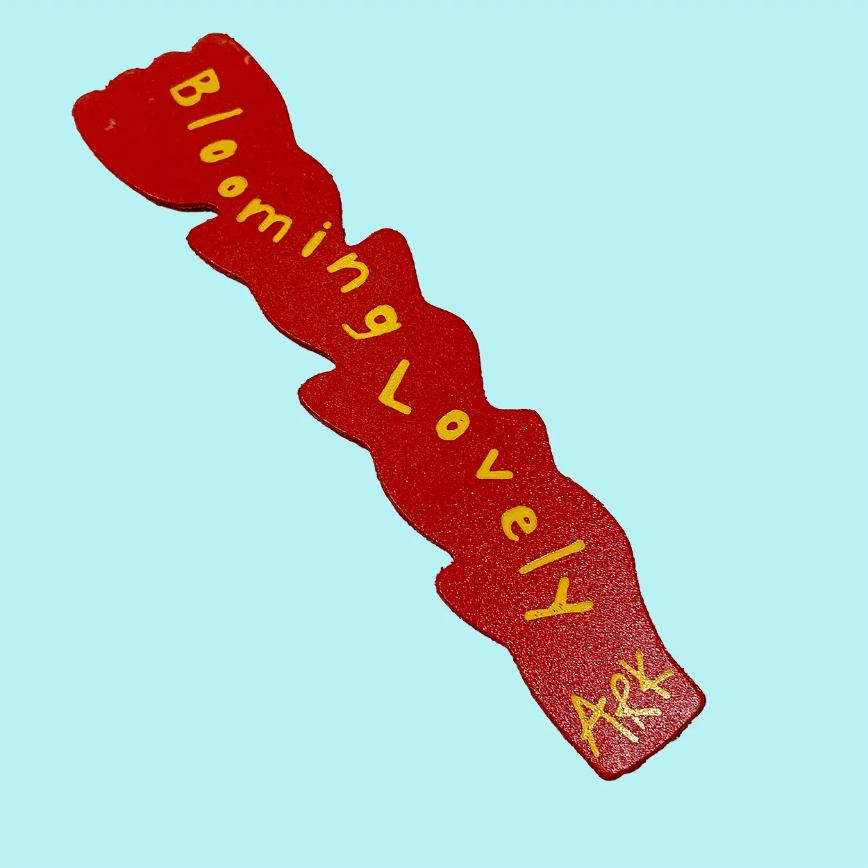 Ark red tulip leather bookmark. Printed on the back with the words blooming lovely in yellow on red.