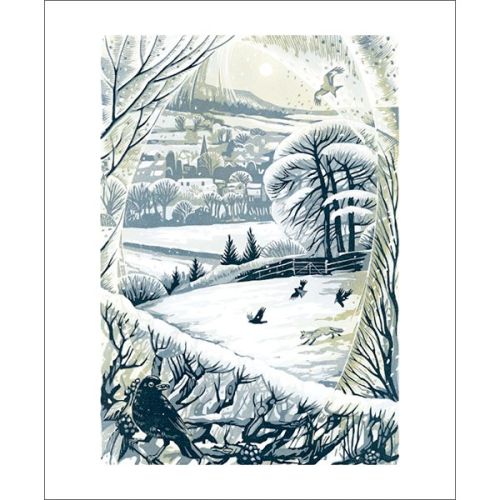 Between snow showers, a wintery English country landscape scene reproduced as a greetings card from a linocut print by Martin Truefitt-Baker.