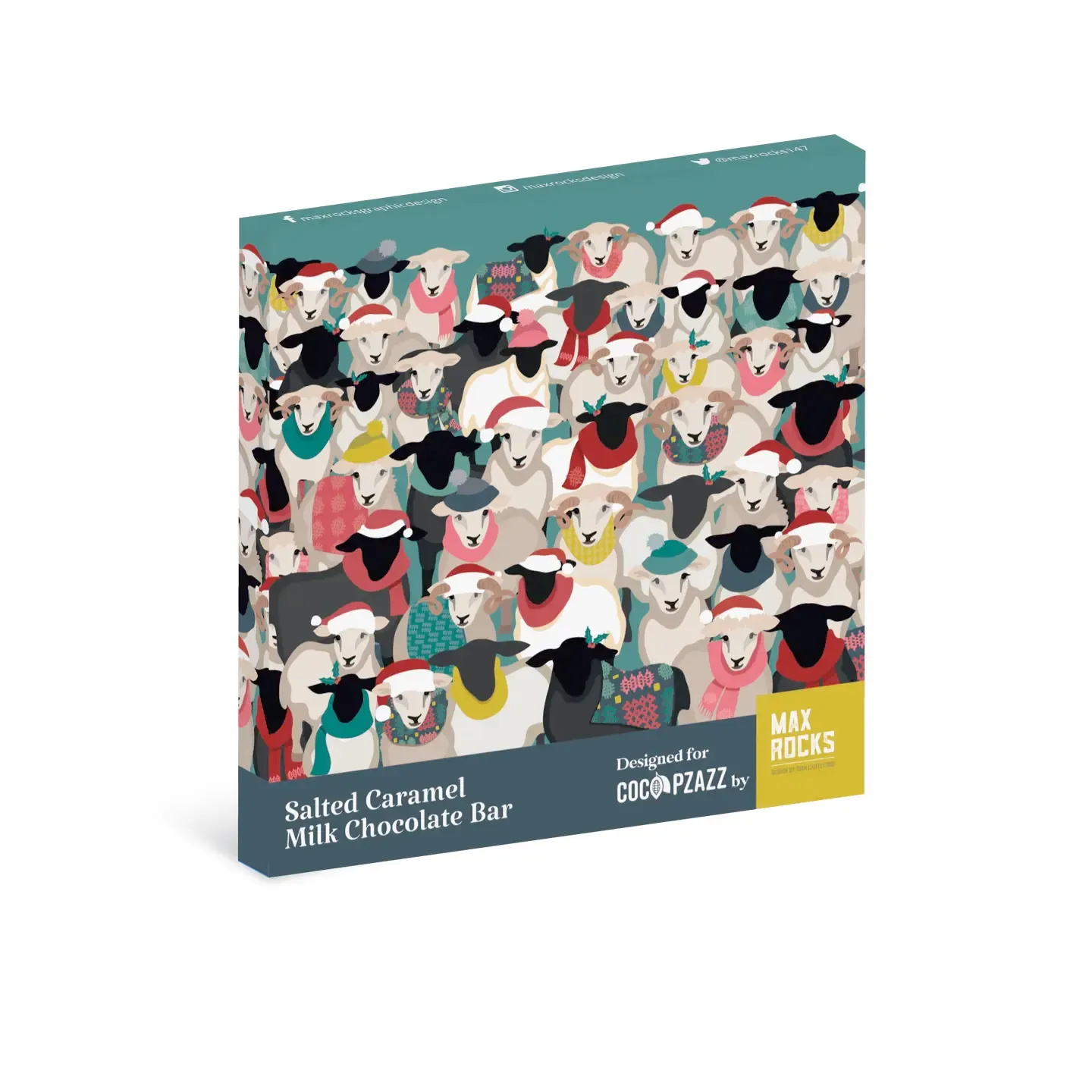 Coco Pzazz salted caramel milk chocolate bar with a Christmas sheep outer box designed by Max Rocks.