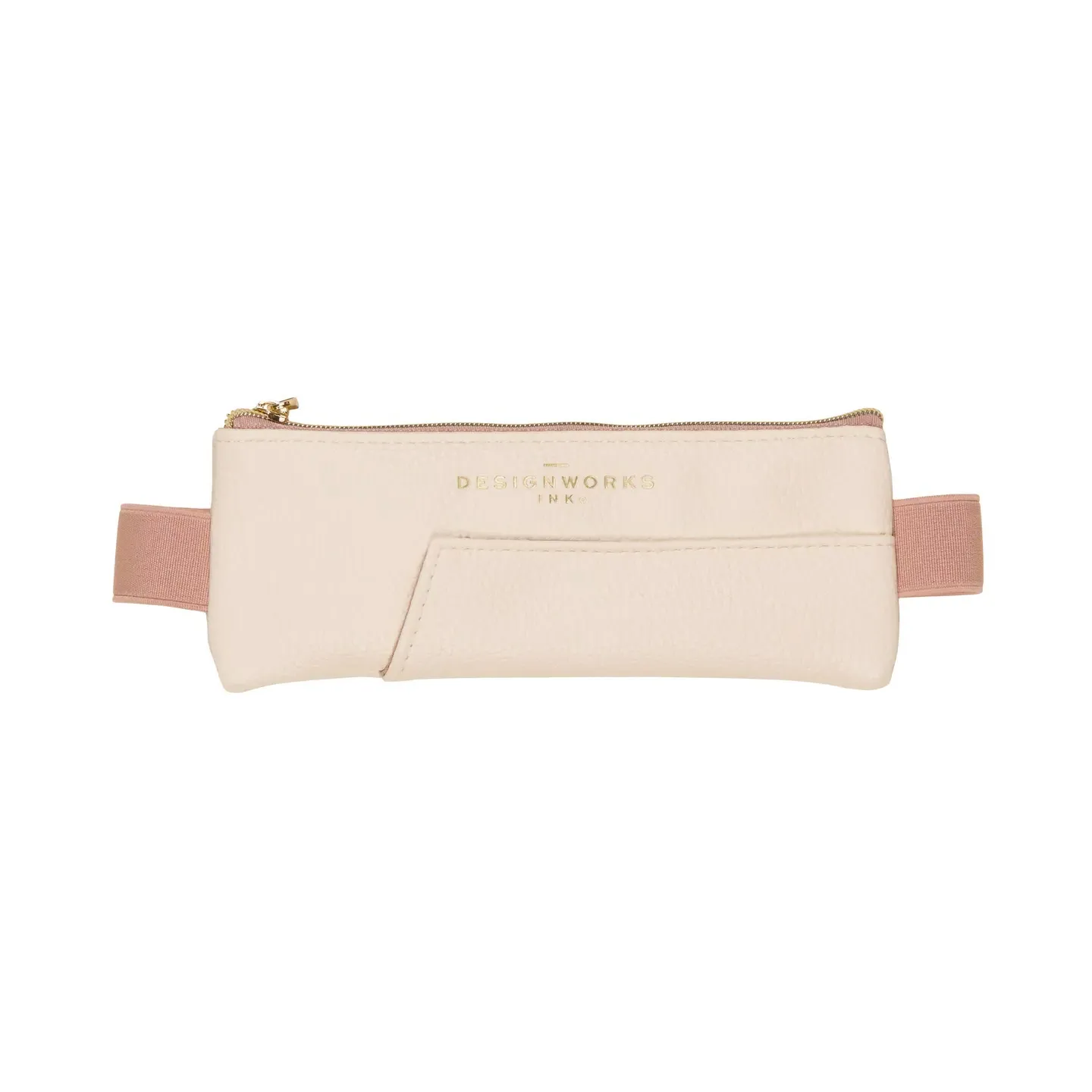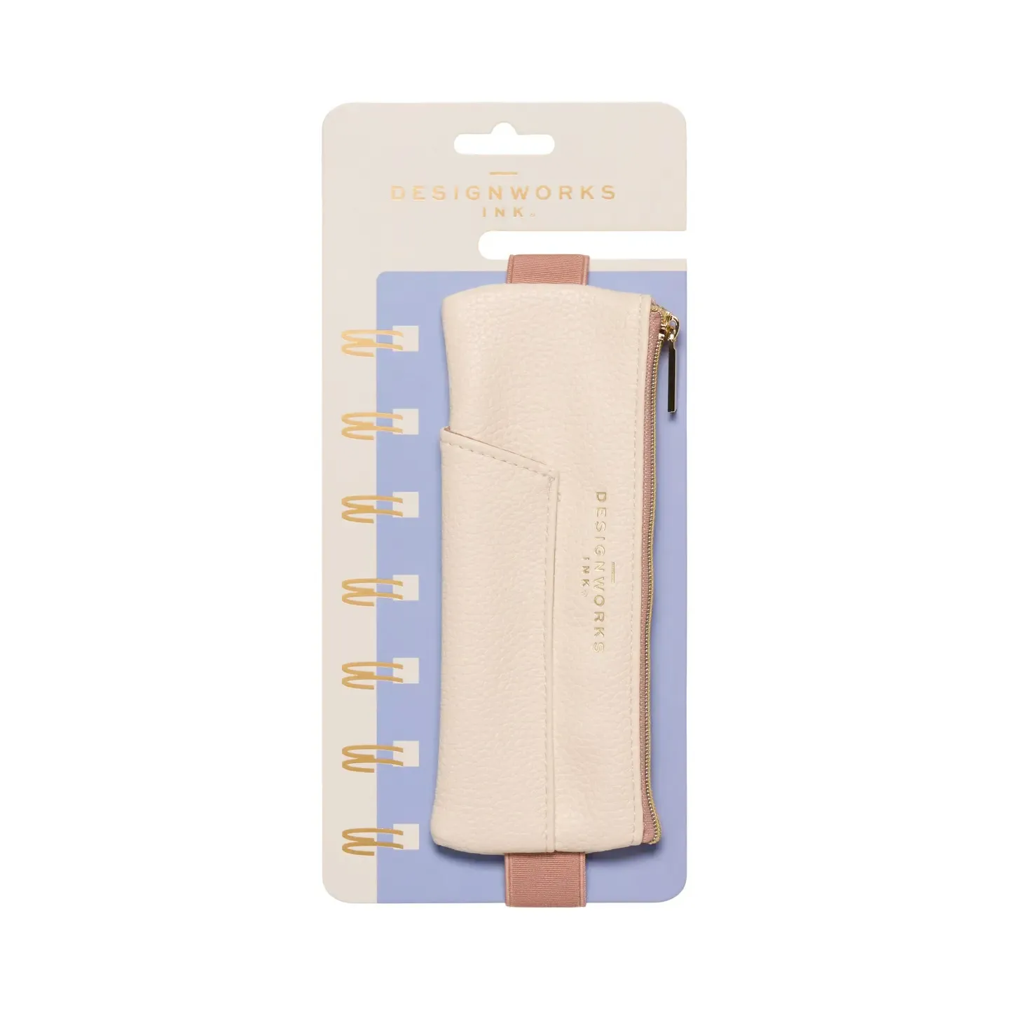 Designworks notebook pen pouch with adjustable elastic strap. Keep you stationery and notebook together with this clearly little accessory which allows your pencil case to be secured to the cover of your notebook or journal using the adjustable strap. Fits cover sizes 5"x8" to 8"x10".