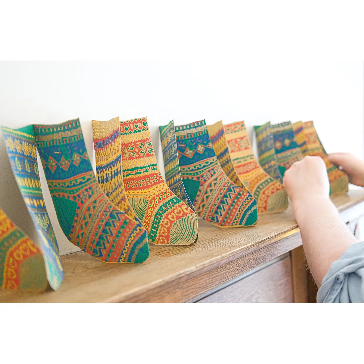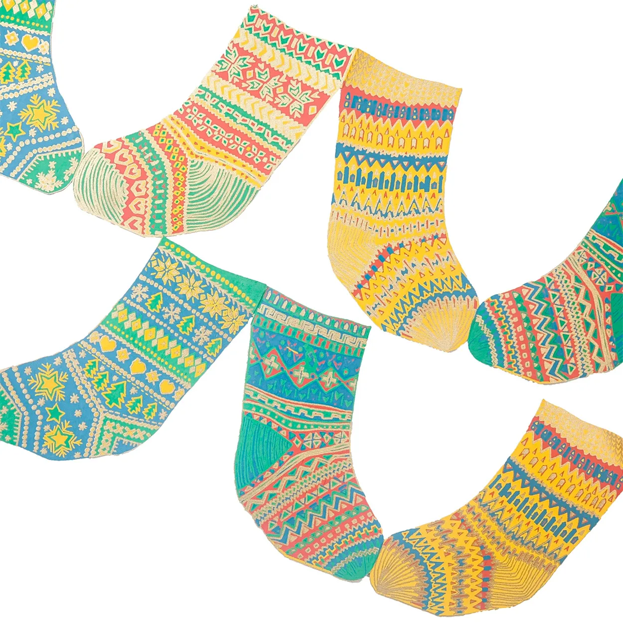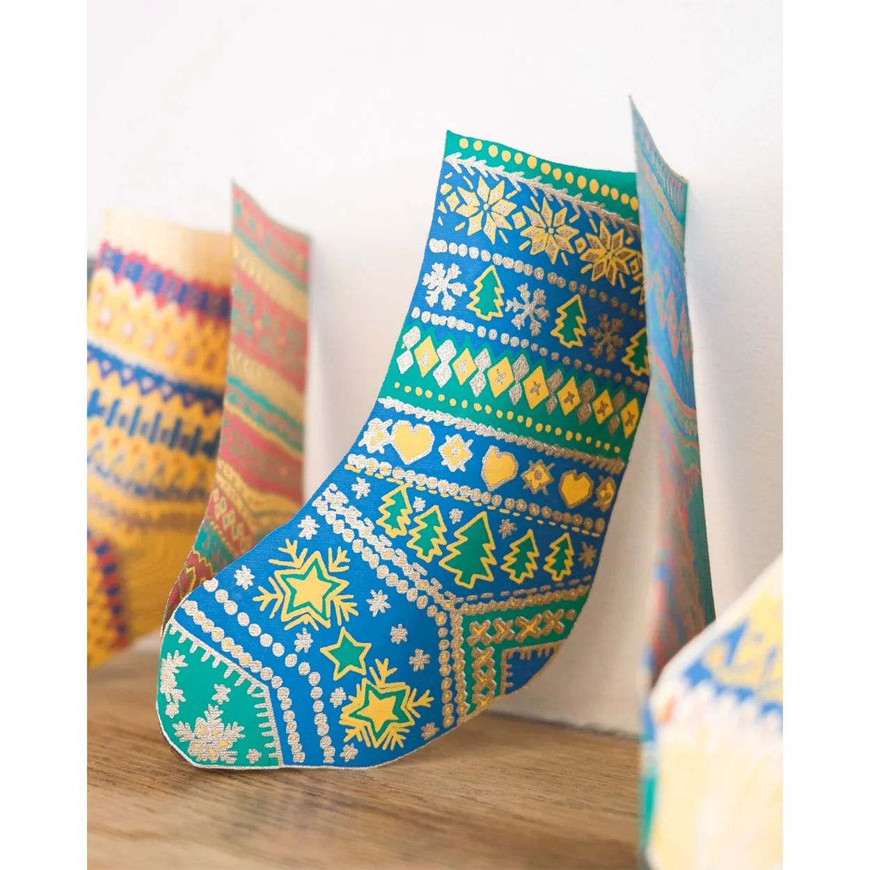 East End Press stockings Christmas concertina garland. Four hand printed designs repeated over twenty shapes joined together to create a 3 metre long free standing garland.