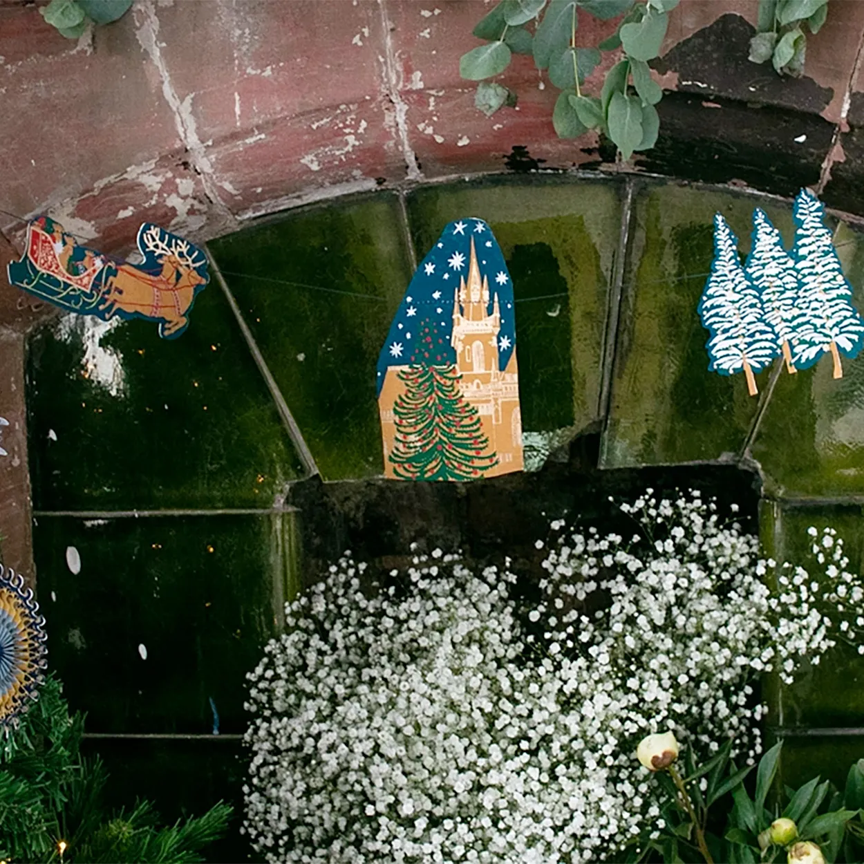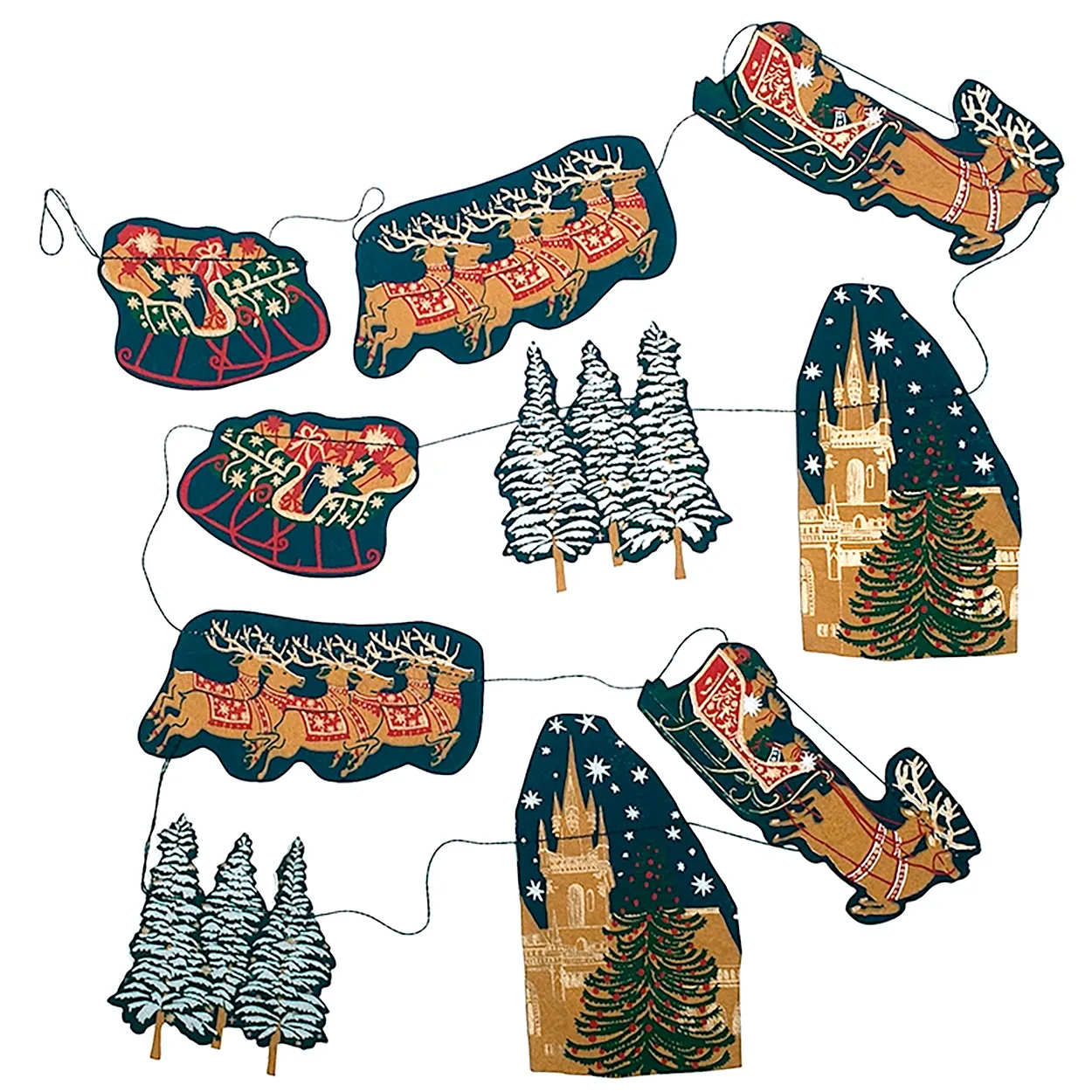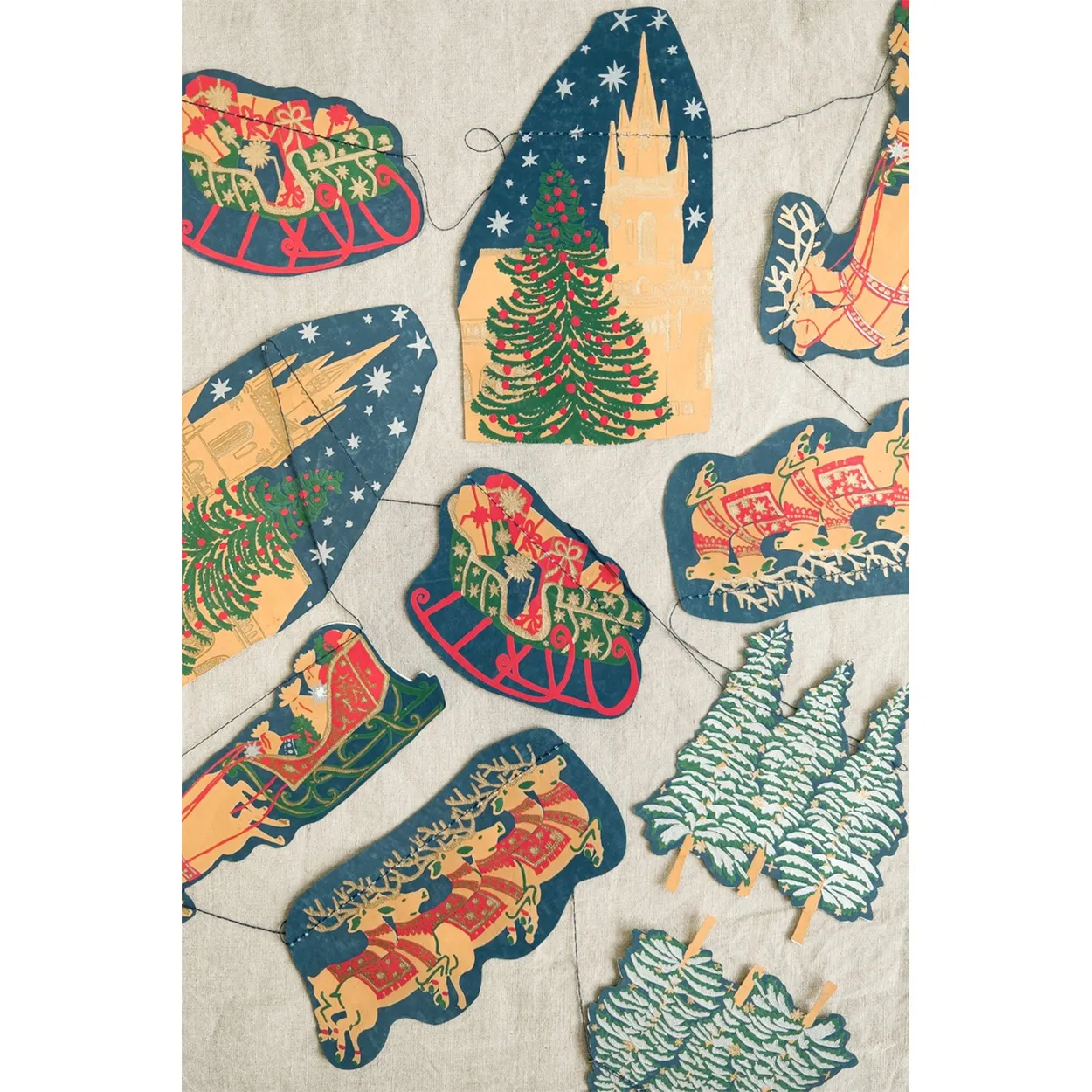 East End Press skyline Christmas sewn garland. Hand printed recycled paper shapes featuring Santa in his sleigh, snowy trees and reindeer. Ten shapes sewn on to a cotton thread measuring 3 metres long.