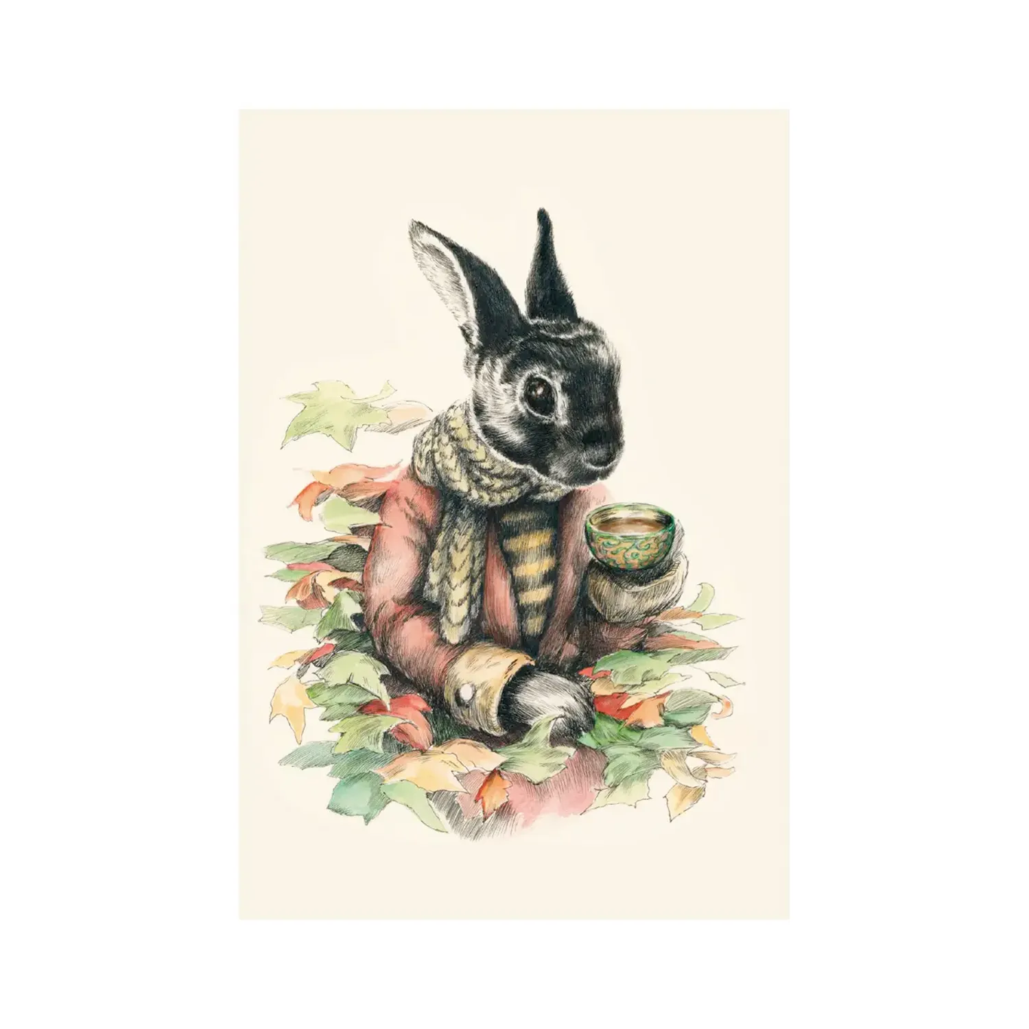 Elise Hurst rabbit amongst maples greetings card. An Autumnal design with a rabbit wrapped in coat and scarf with a hot drink surrounded by falling leaves. Blank inside fir your own words.