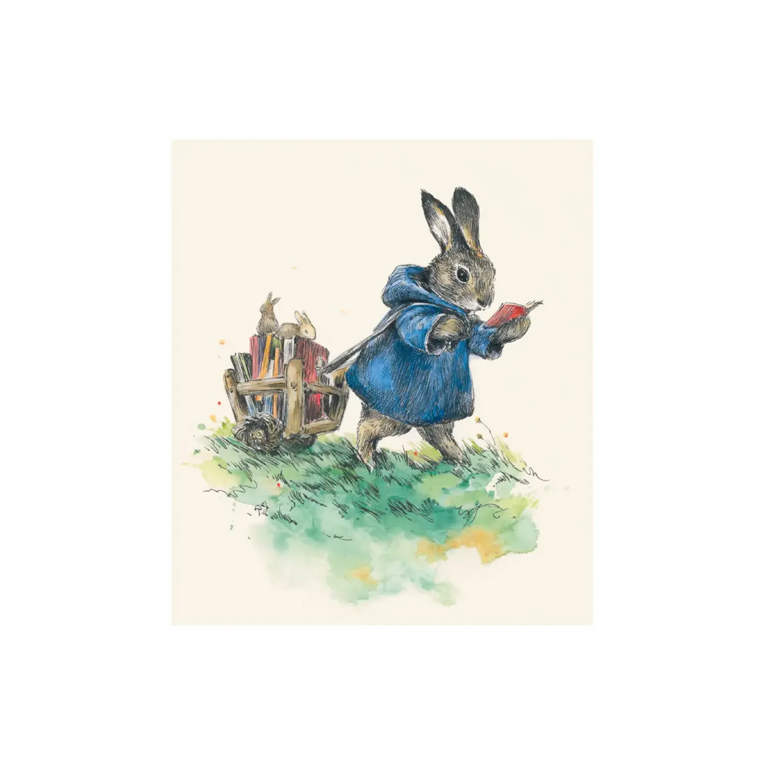 Elise Hurst rabbit pulling books greetings card. A blue jacketed rabbit reading while puling a cart full of books behind them feature in this design. Blank inside for your own words.