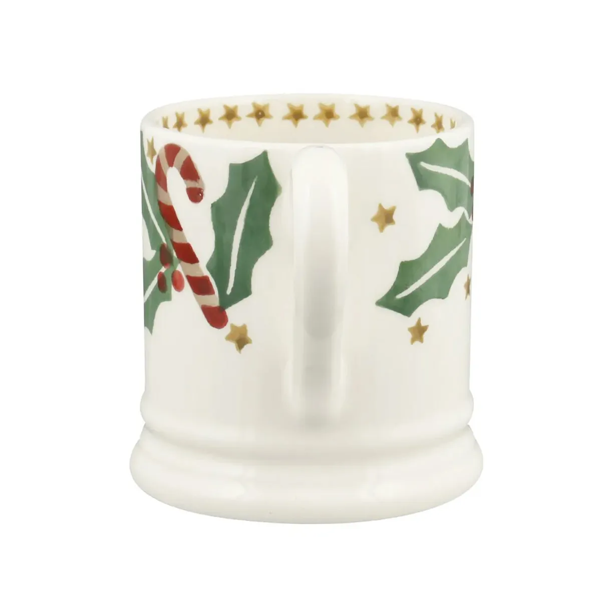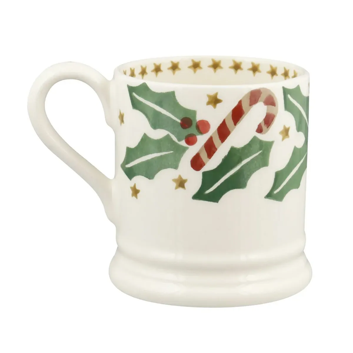 Emma Bridgewater candy canes half pint mug. Hand decorated with striped sugar canes and holly leaves in red and green.