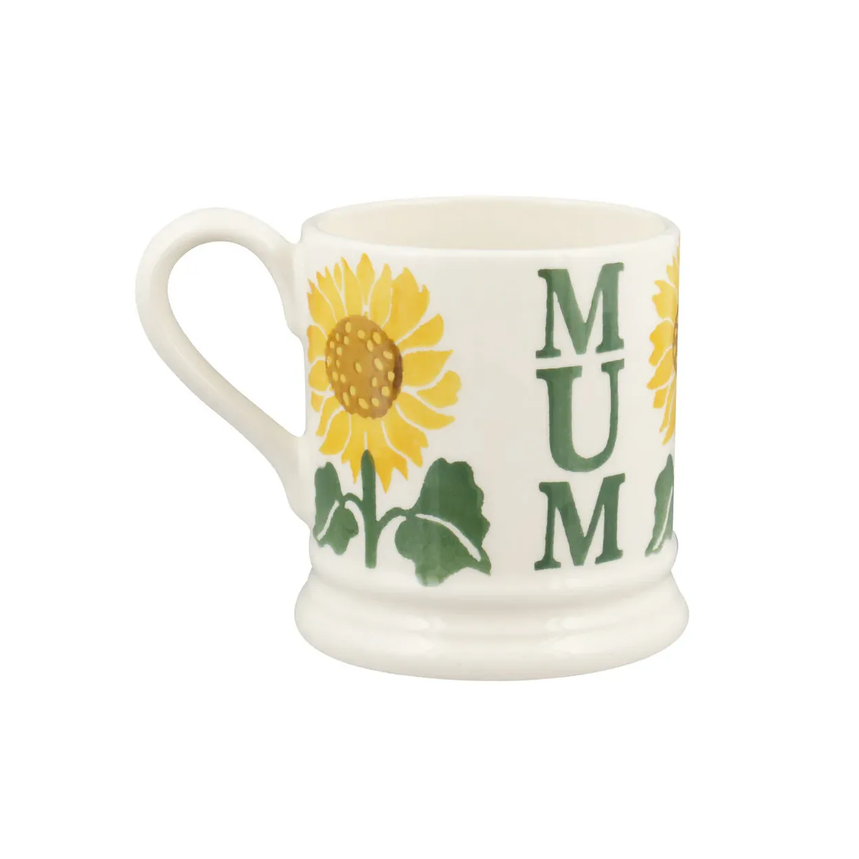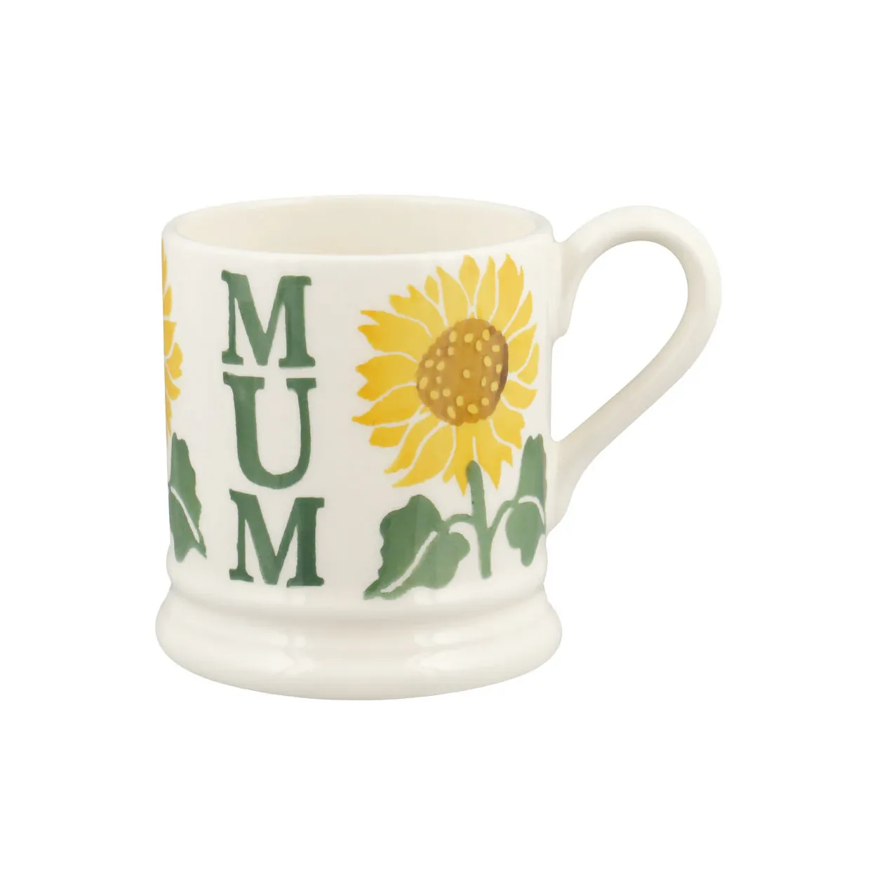 Emma Bridgewater Sunflower mum half pint pottery mug. Hand decorated with vertical Mum lettering between stems of yellow sunflowers.