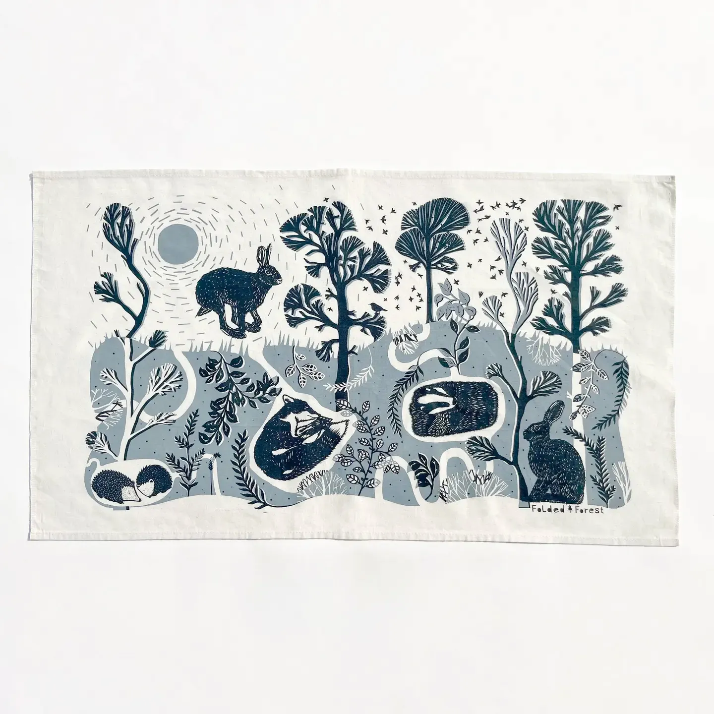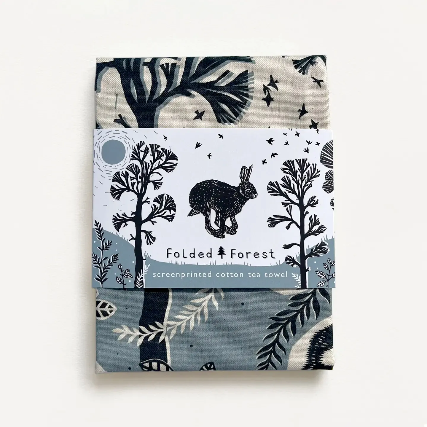 Folded Forest leaping hare tea towel. Single sided screen print on to cotton in lovely shades of blue. Machine washable at 407deeg; Designed and printed in the UK.