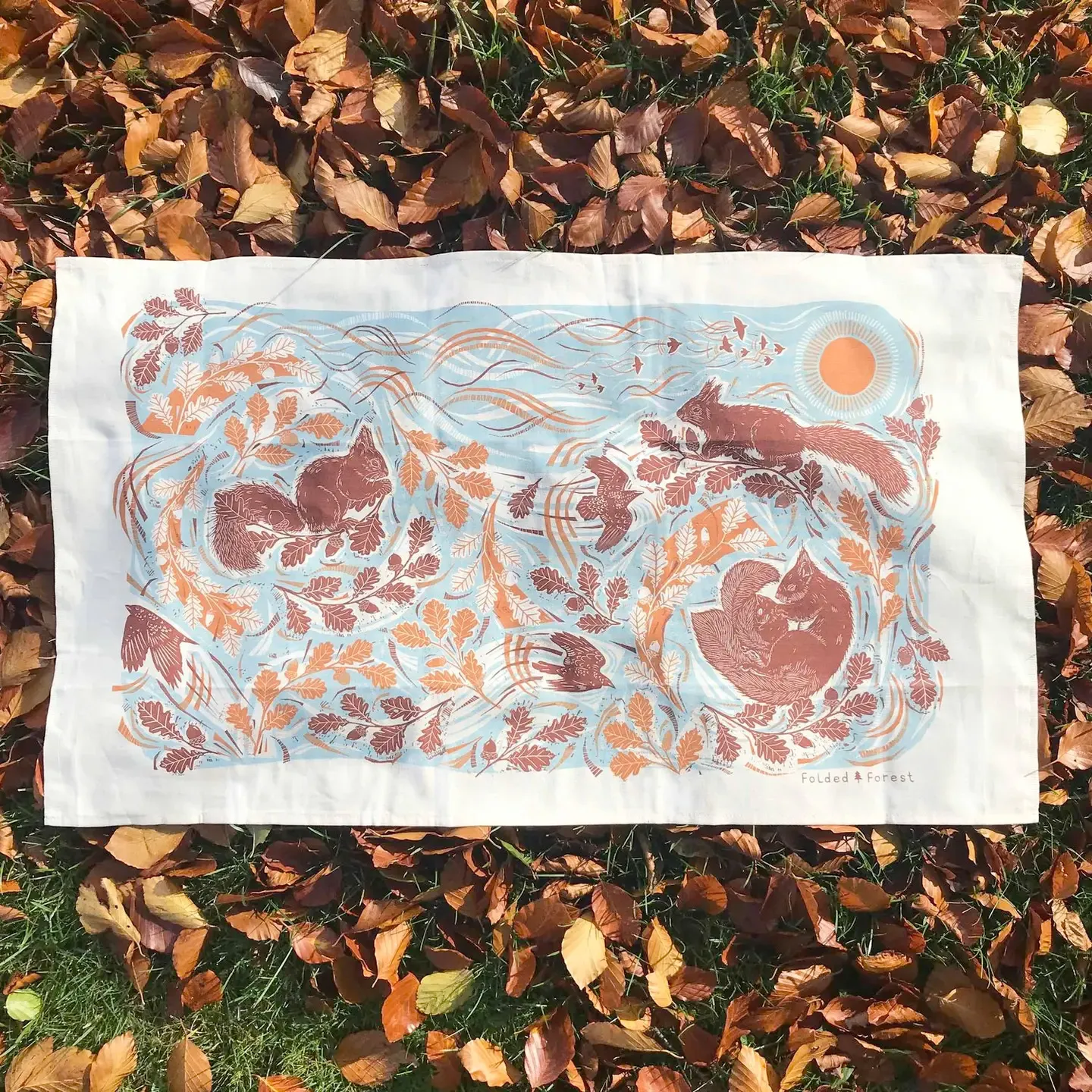 Folded Forest squirrel tea towel. A screen printed cotton kitchen towel with an autumnal designs of squirrels and oak leaves. Single sided print. Machine washable at 40° Designed and printed in the UK.