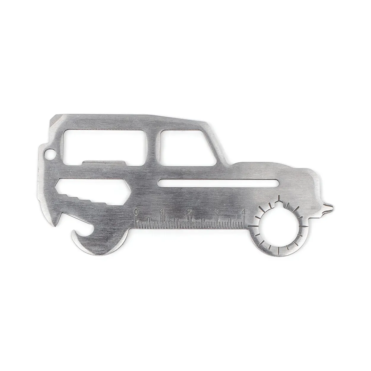Gentelmen's Hardware 4x4 car shaped multi-tool, a flat credit card sized tool featuring a bottle opener, flat and philips head screwdriver, ruler, assorted wrenches, and can opener.