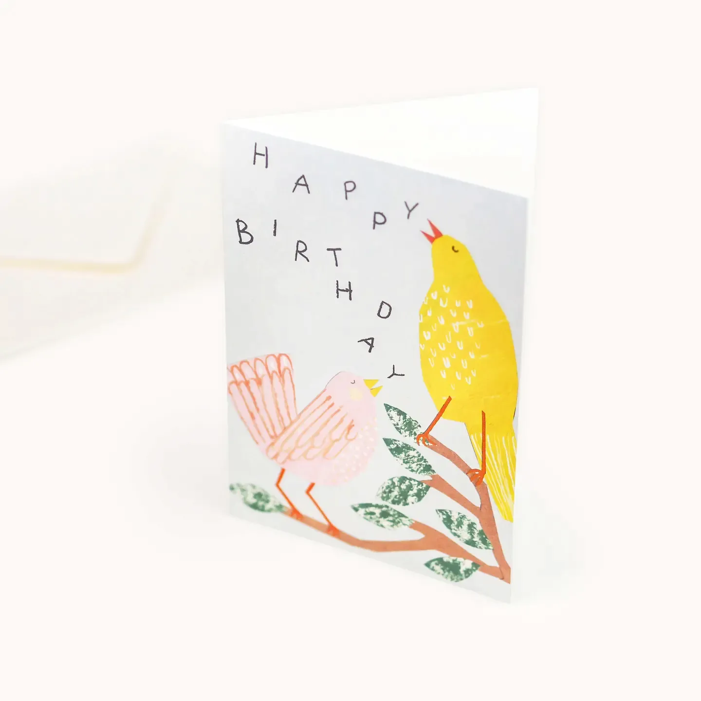 Hadley birthday birds happy birthday card with pink and yellow singing bird design. Blank inside.