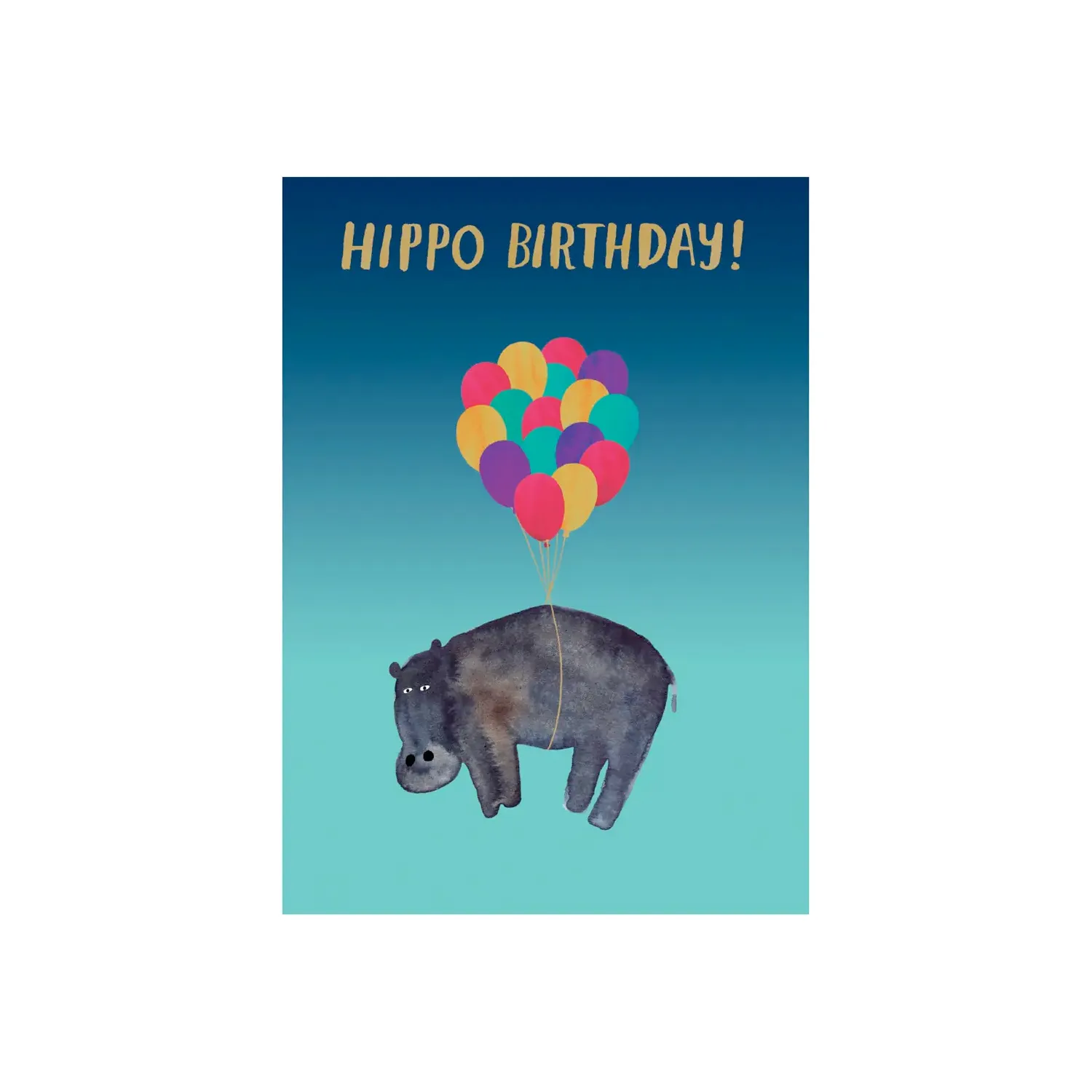 Hippo happy birthday card illustrated with a hippopotamus floating in air suspended from a bunch of balloons. Blank inside.