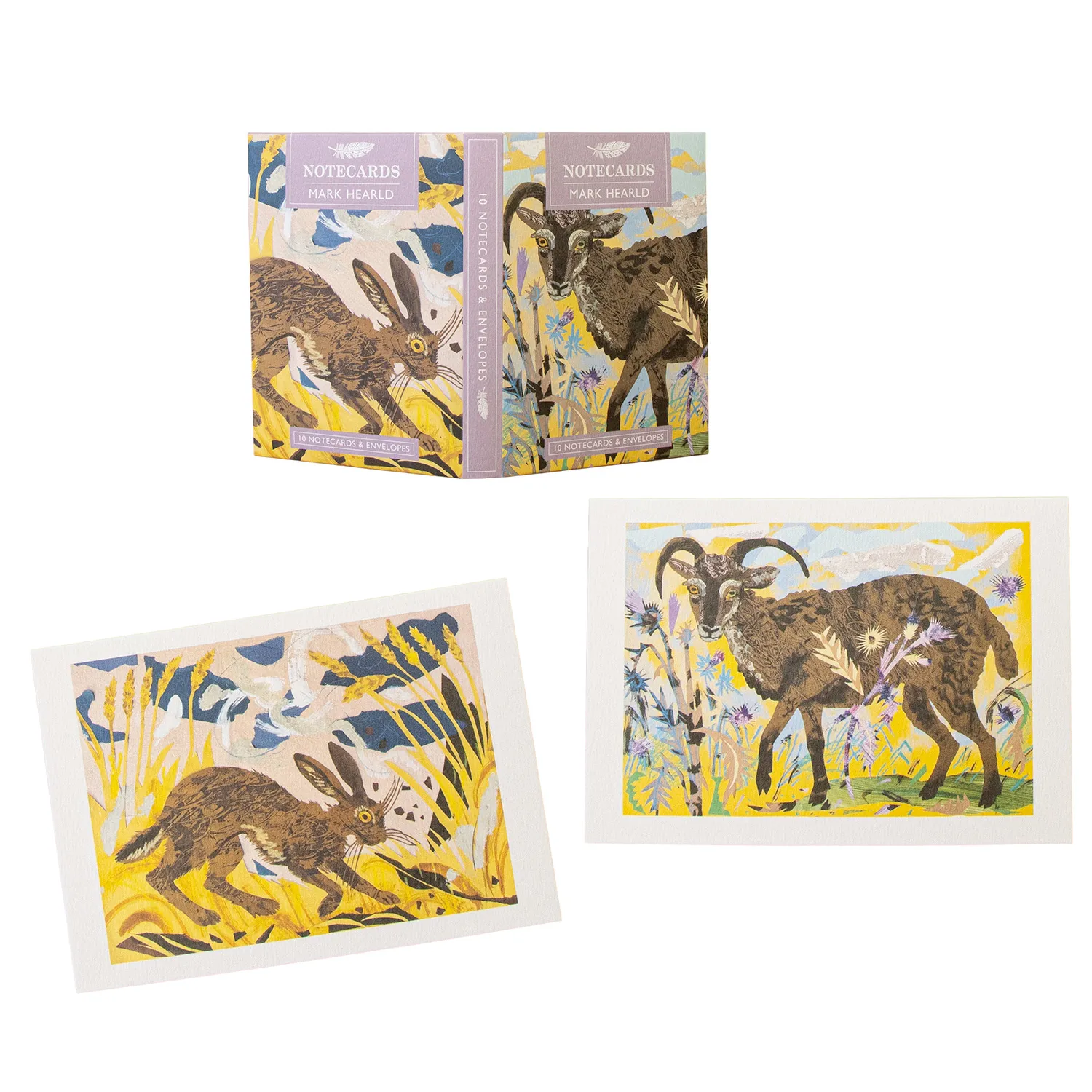 Mark Hearld soay sheep and hare note cards. A card wallet containing ten cards with envelopes with two designs reproduced from collage images. Cards measure 14.8cm x 10.5cm.