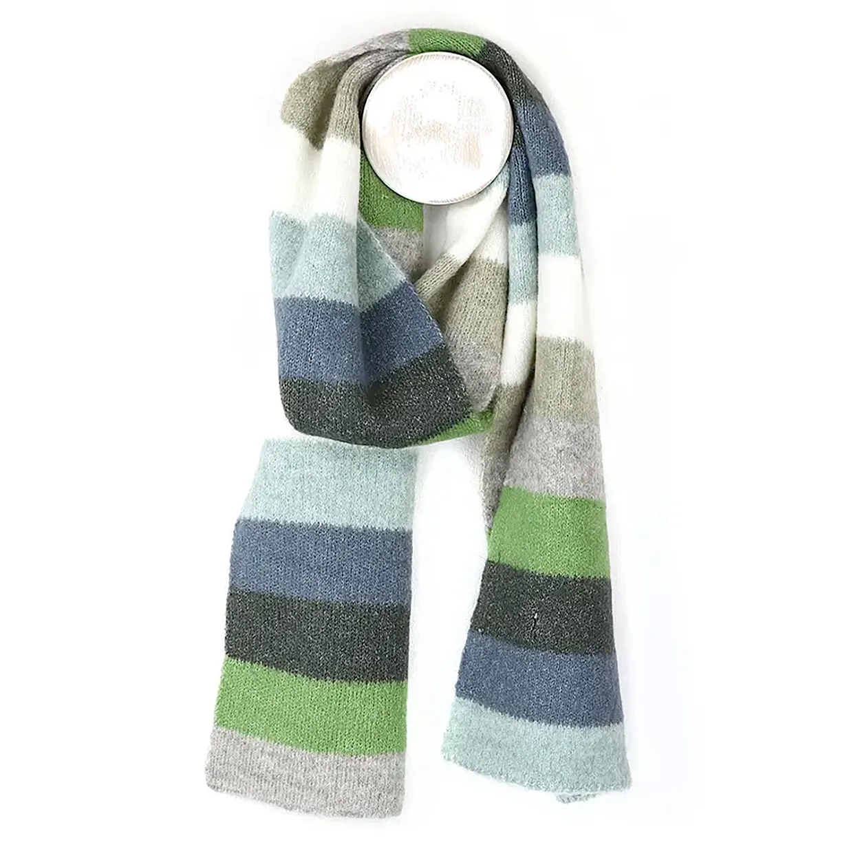 A lovely soft knitted striped scarf in green, shades of blue and beige with wide alternating bands of colour.