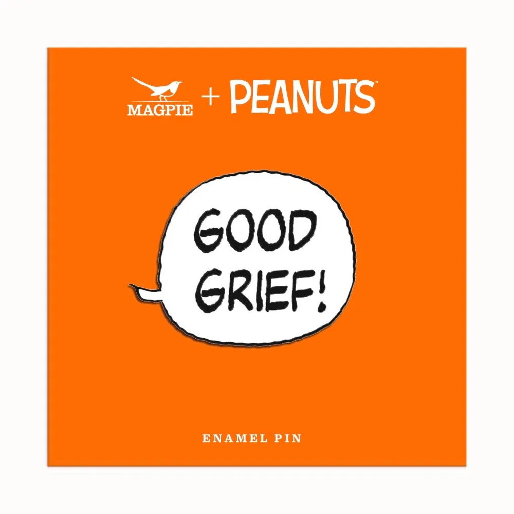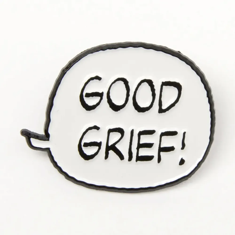 Peanuts good grief speech bubble metal and enamel pin badge. Images show product larger than actual size.