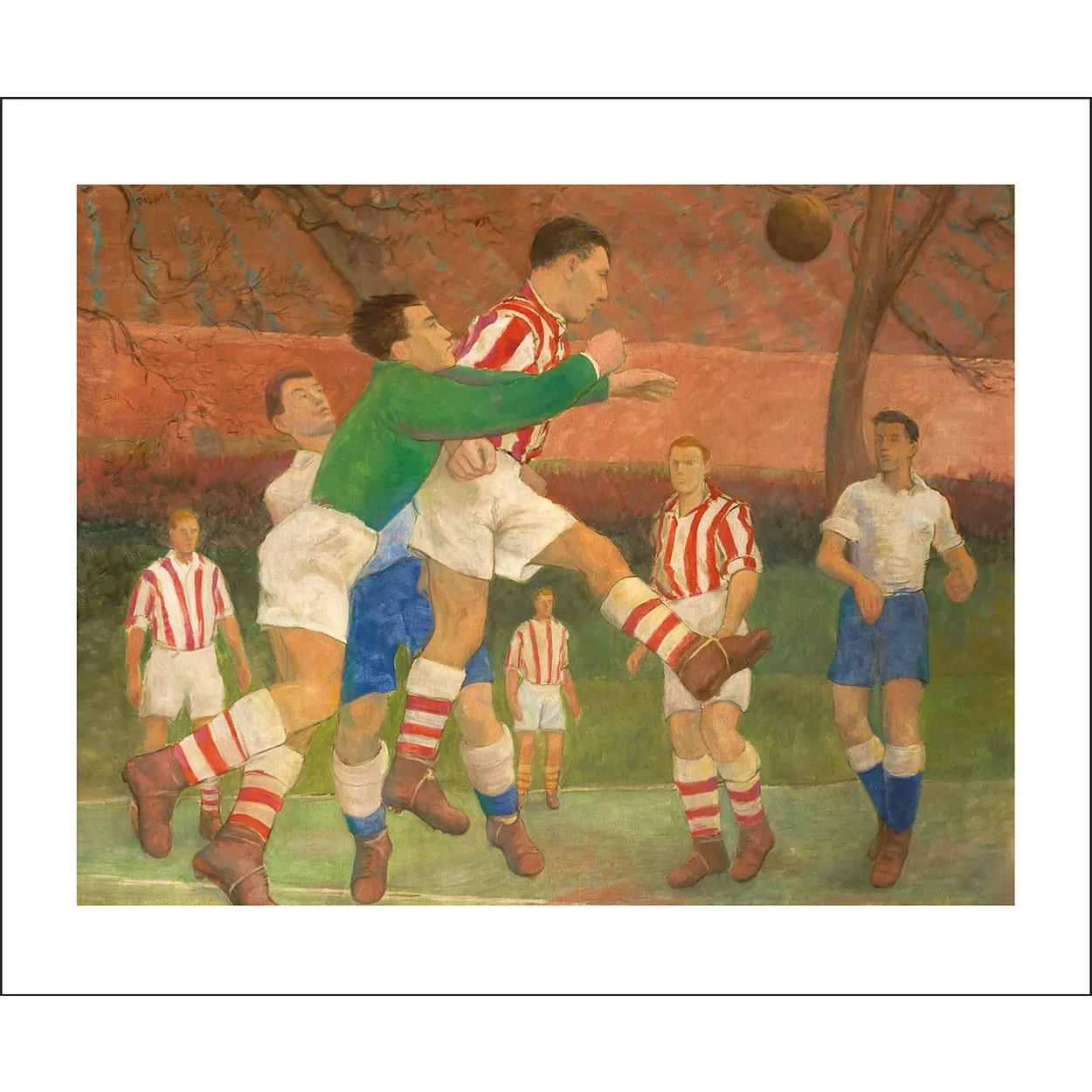 Peter Samuelson football match greetings card. A 1950s game of football reproduced from an oil on canvas painting. Peter Samuelson was born in Salisbury, educated at Eton and studied at New York School of Fine and Applied Arts, Paris, before running boarding houses where his guests provided the inspiration for his art.