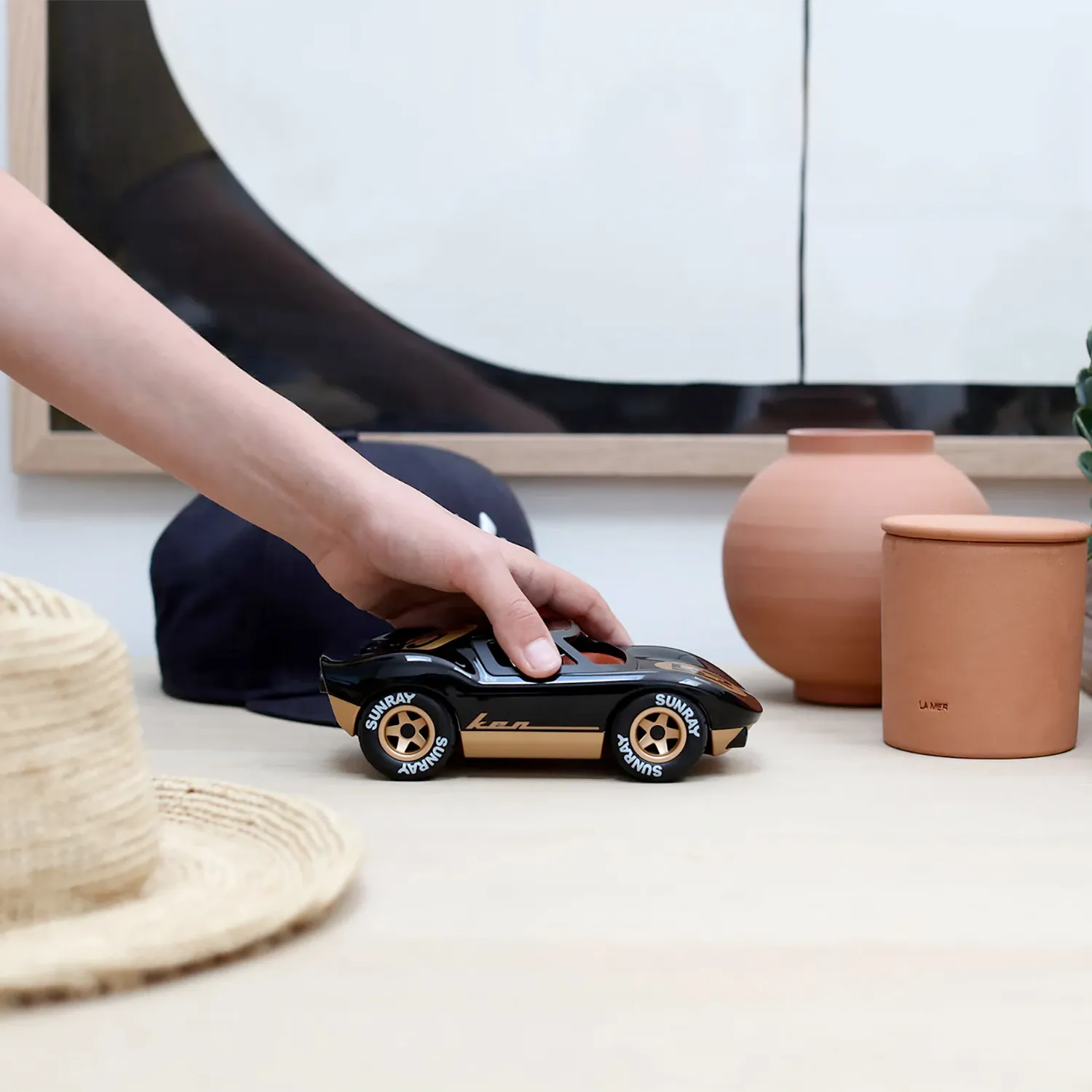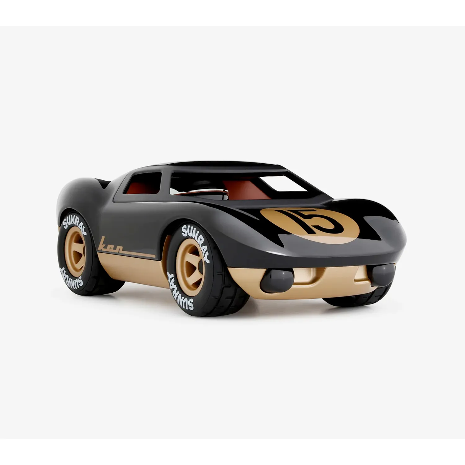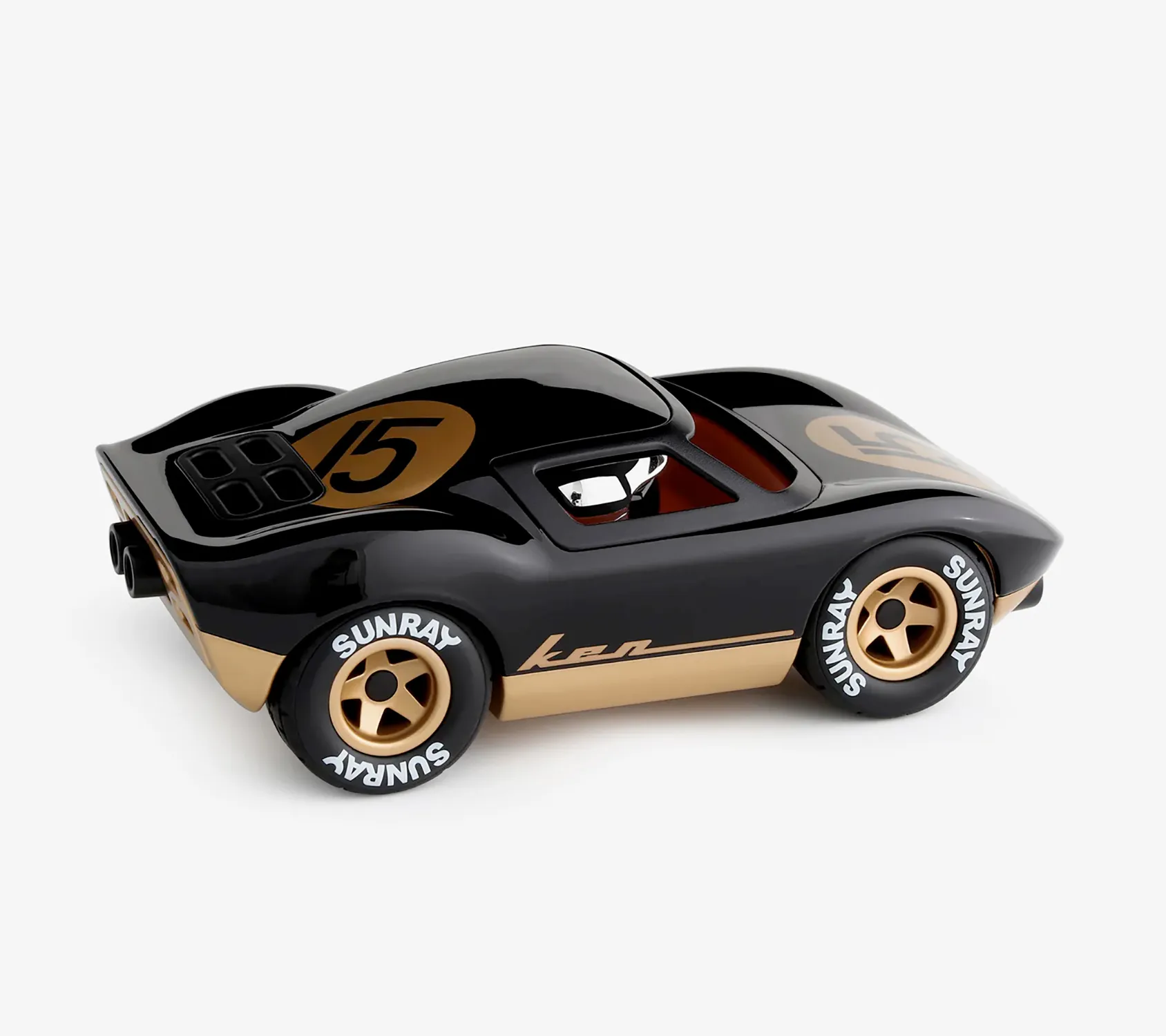 Playforever Ken Cave model toy car. A striking black and gold livery drawing inspiration from a famous motorsport colour scheme from the 1970s decorates this 1960s inspired Le Mans racer which is named after the famous driver responsible for the cars development and racing heritage.