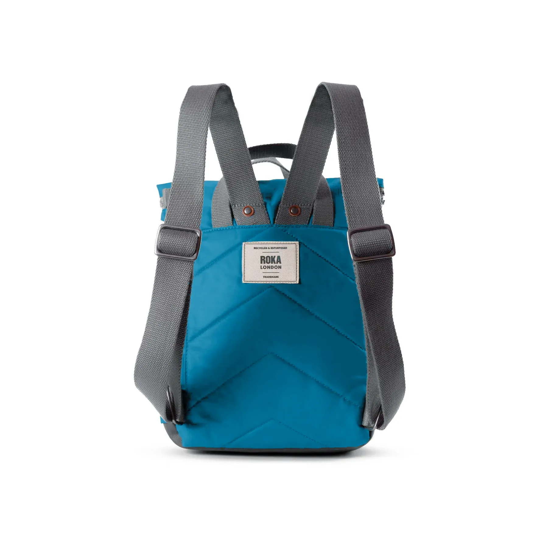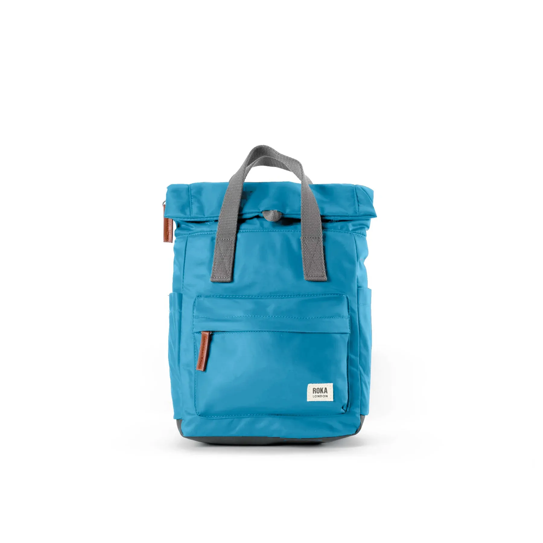 Roka London Canfield B small backpack in marine blue with a nylon style finish. Weather resistant with fold over zip closing top, two external pockets and a padded space for a tablet computer. Capacity 7 litres.