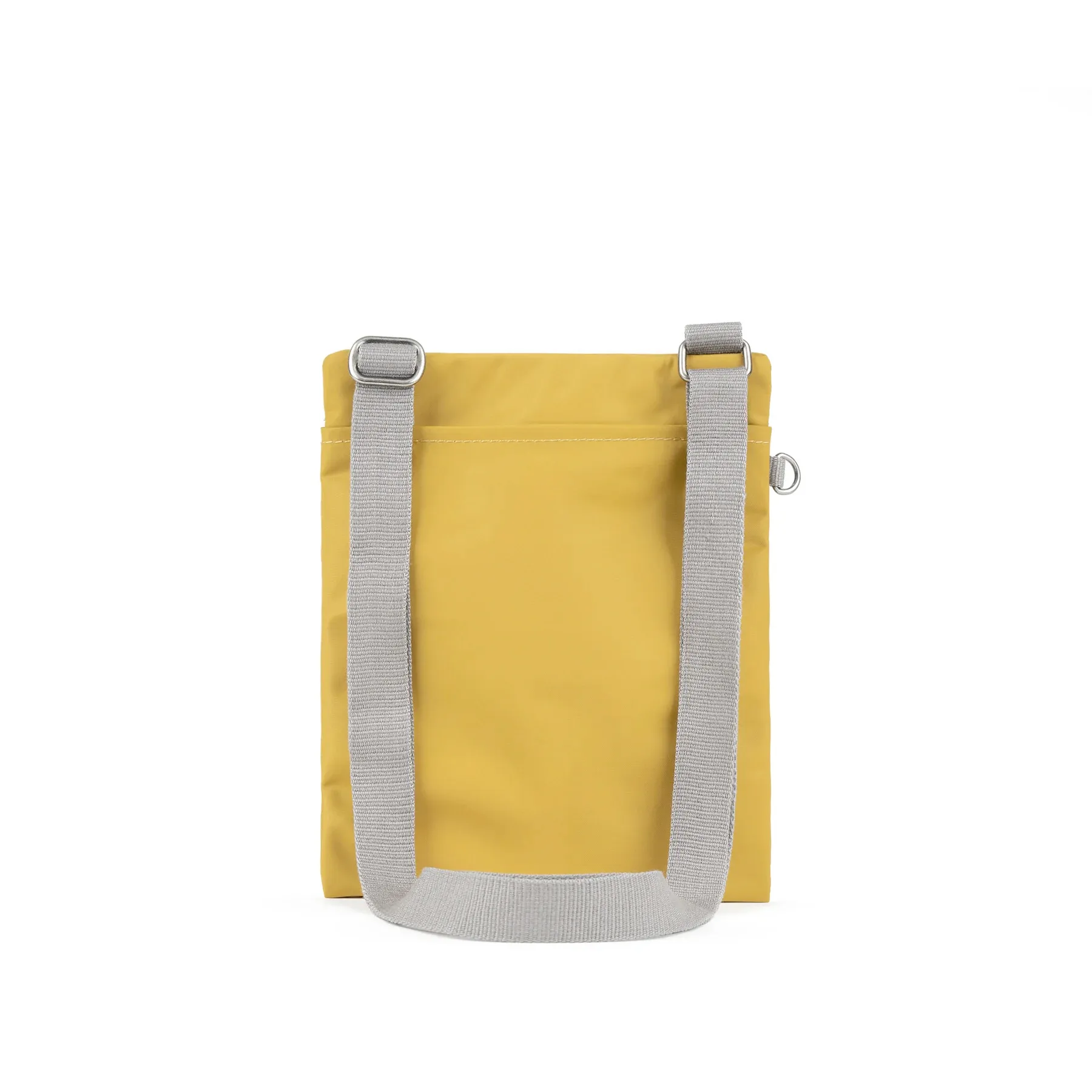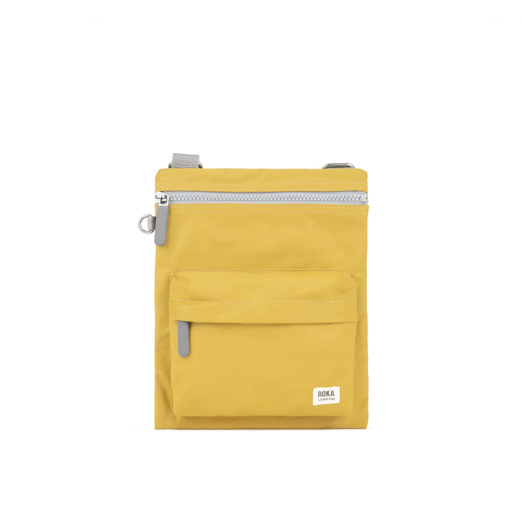Roka Chelsea B medium cross body bag in corn nylon. A Practical bag with ample space for the daily essentials, zip closing central section, two external pockets and a fully adjustable across-body strap. Lined in grey with grey zips and details.