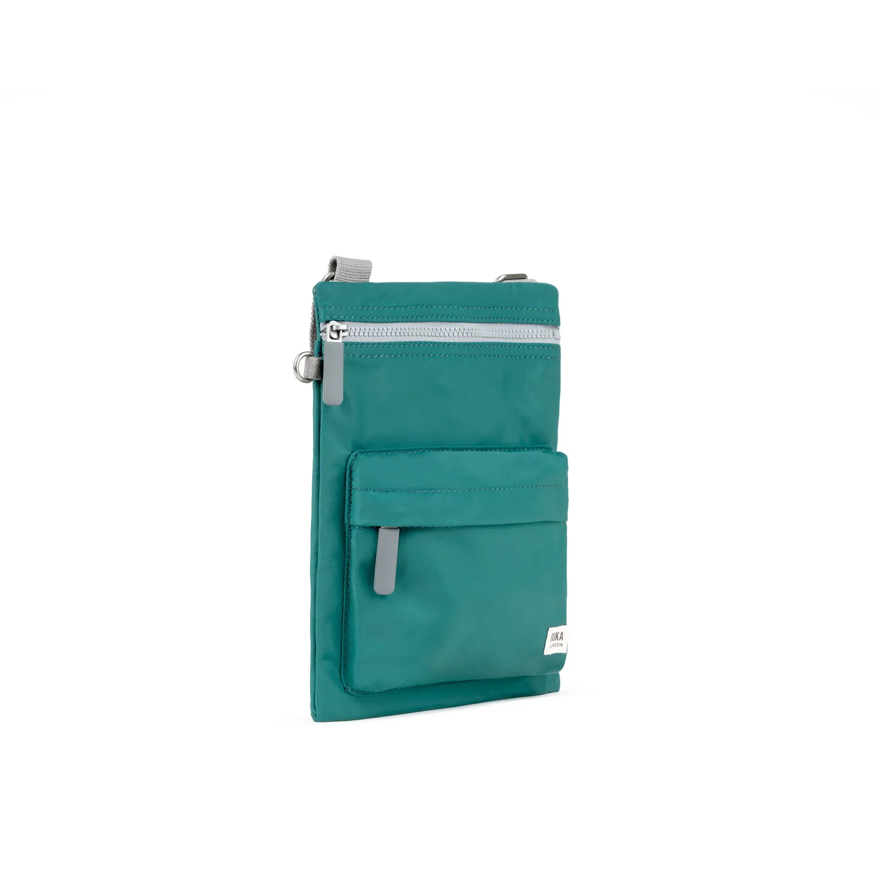 Roka London Chelsea B medium cross body bag in a lovely shade of teal. Made from recycled materials this handy bag has two pockets on the outside and one main compartment which closes with a sturdy zip.