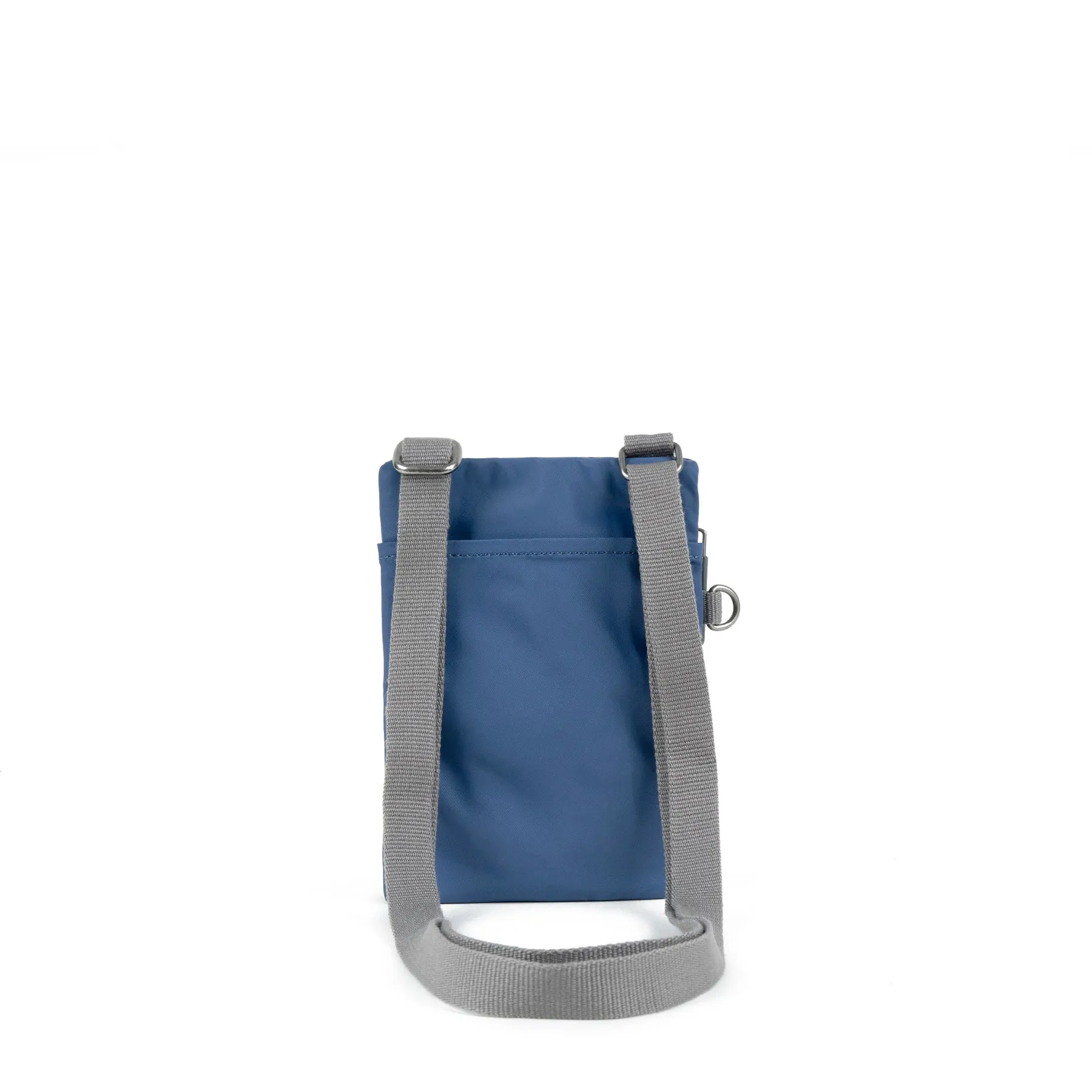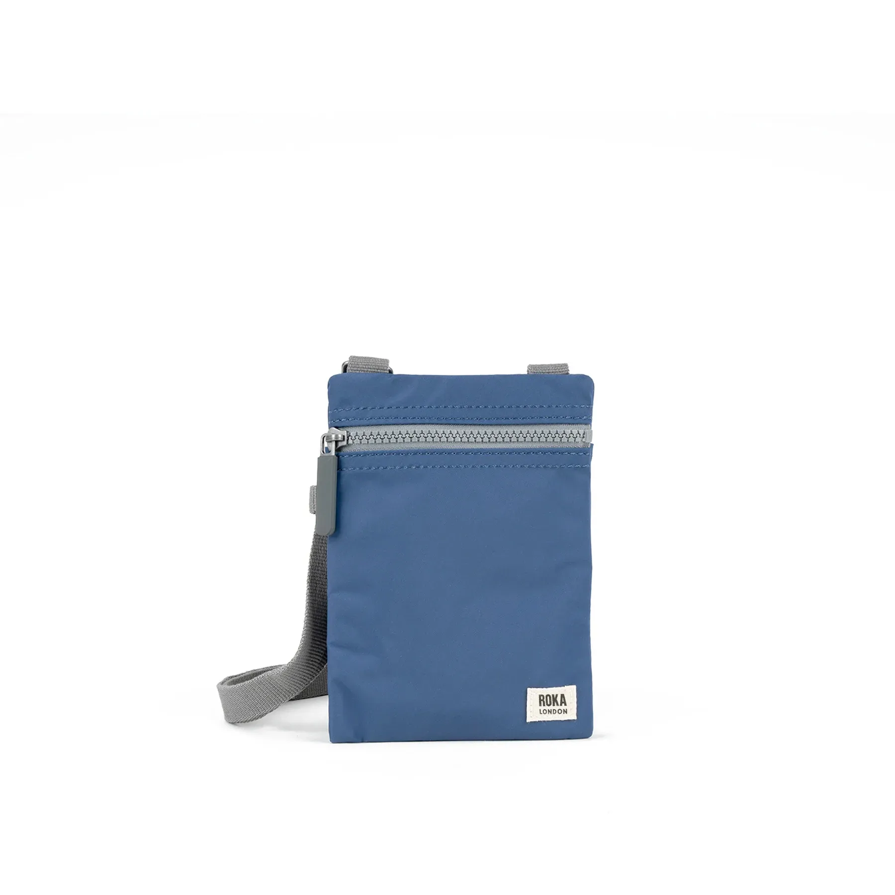 Roka Chelsea pocket sling bag. A handy little across body bag in burnt blue with a single zip closing compartment and open external pocket, full adjustable strap in grey to match the zip and zip pull. made from a recycled nylon style fabric which is weather resistant.