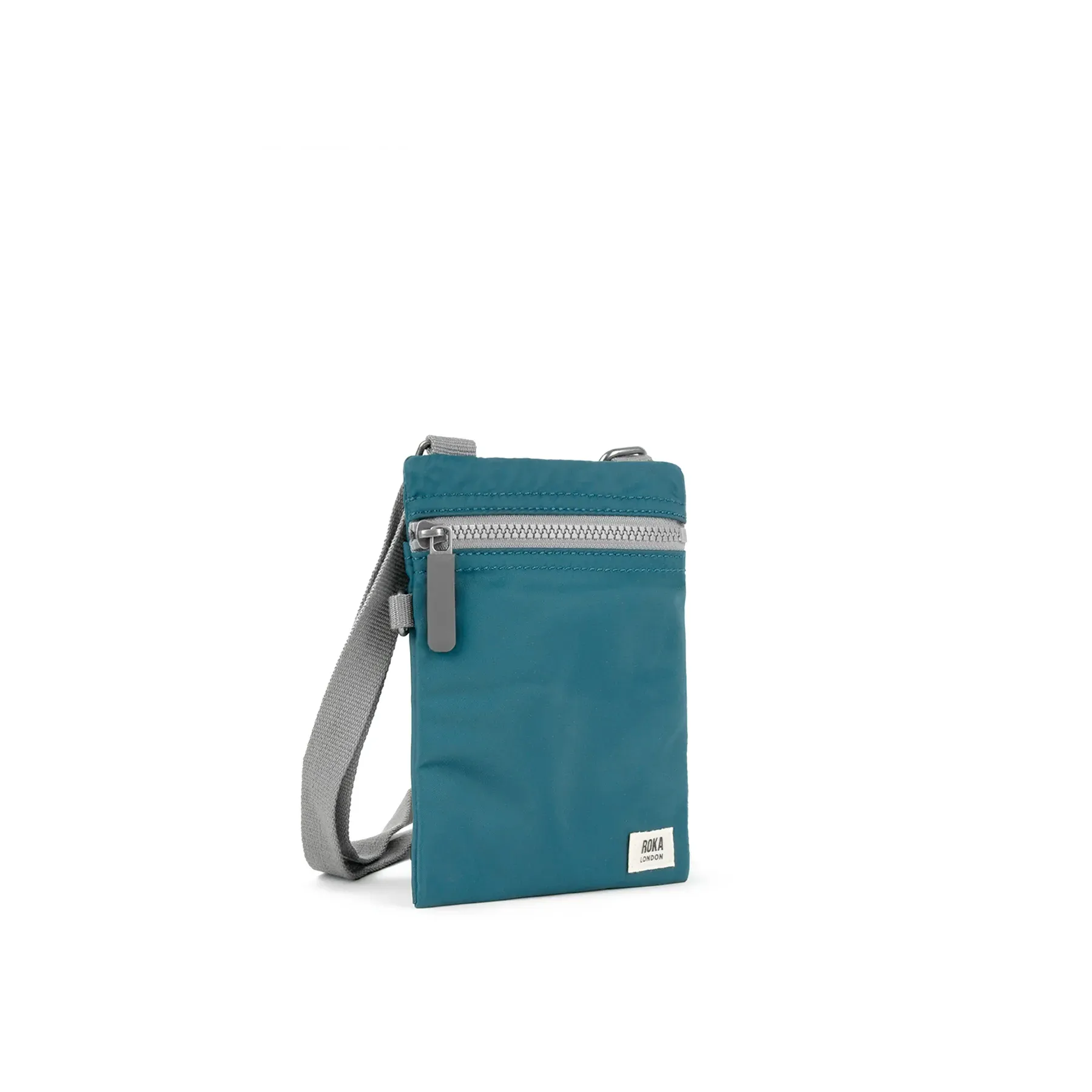 Roka Chelsea pocket sling bag in teal, this simple uncomplicated companion is ideal for those quick jaunts out with just enough space for a few essentials. Made from tough recycled nylon style fabric with adjustable strap and zip closing top, it's even small enough to slip in a large coat pocket.