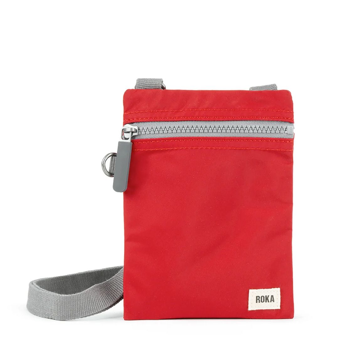 Roka Chelsea sustainable nylon pocket sling bag in cranberry. These useful little pouch bags are idea for carrying your phone, a lip balm and a few other essential items while out walking or letting your dog take you for a strool.