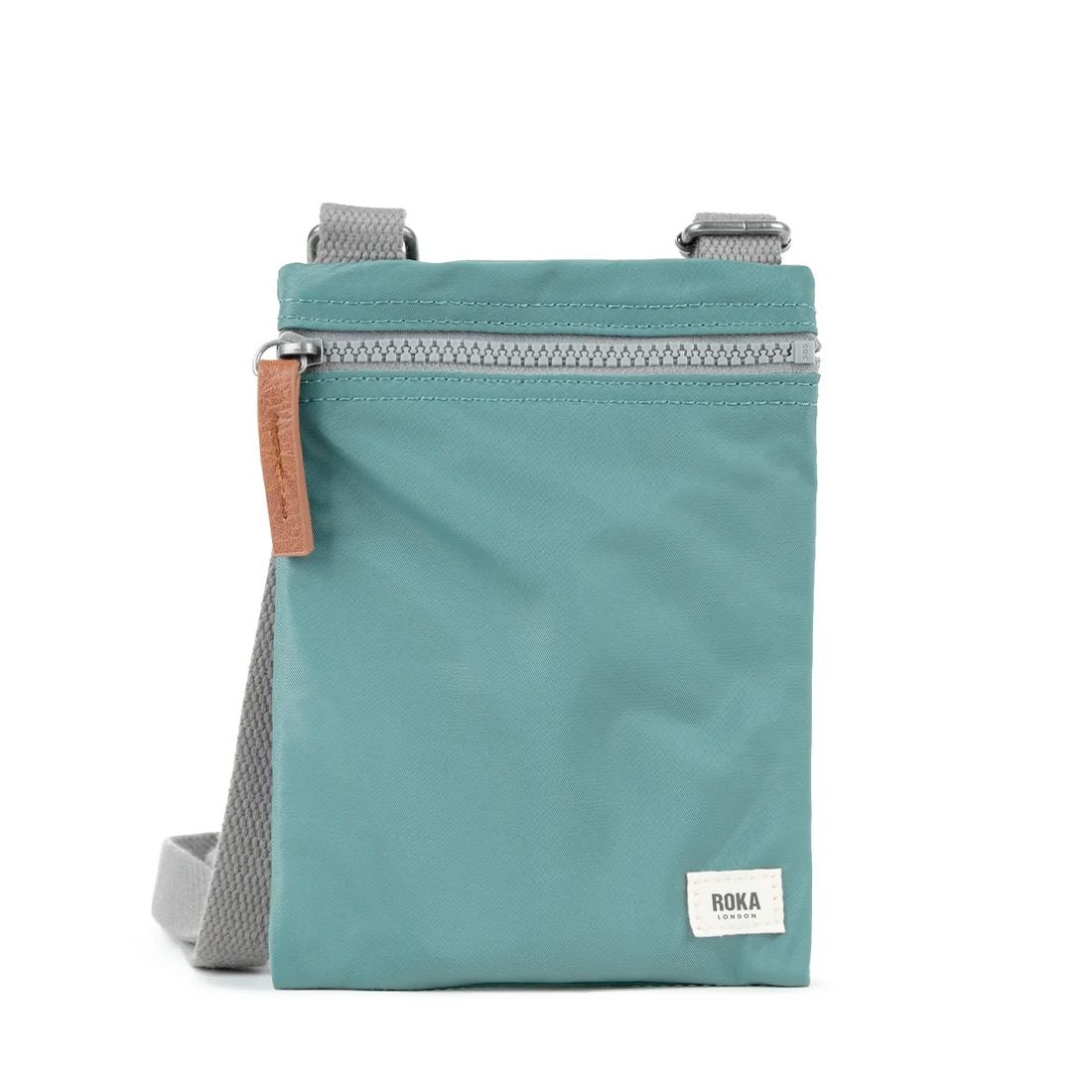 Roka Chelsea sustainable nylon pocket sling bag in sage green with single zip opening an long adjustable shoulder strap. Single divider to the inner compartment. A great little bag for dashing out with just your phone and a few little bits rather than taking a huge handbag.