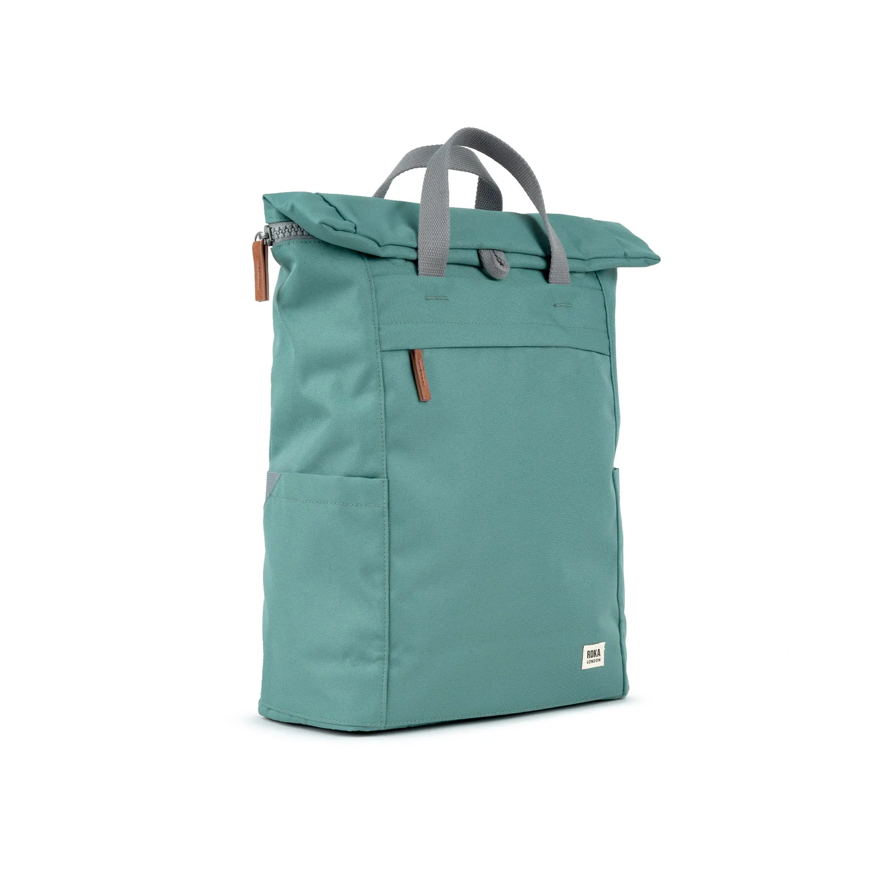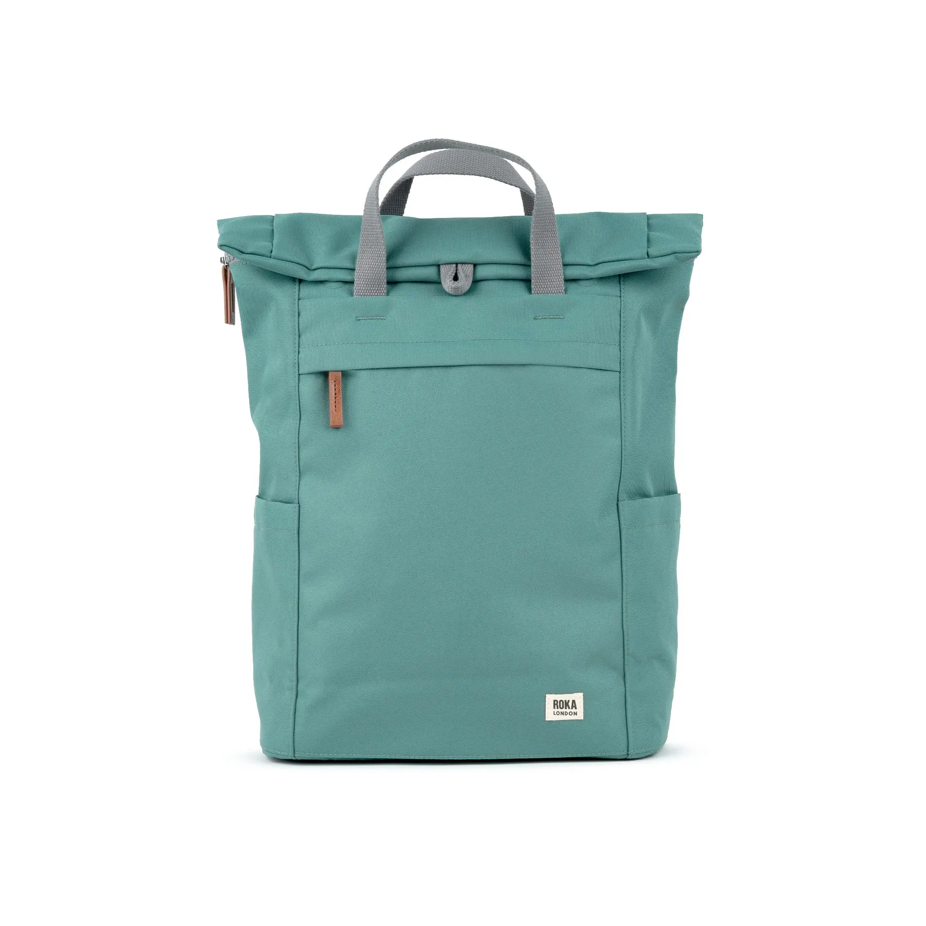 Roka large sage green Finchley A backpack. With a capacity of 10L this is a great bag with plenty of room for a day or two away or even a long weekend. Made from weather resistant recycled canvas style fabric with grey fixtures and straps, this urban rucksack is stylish and functional with pouches for water bottles and a padded compartment for a laptop.