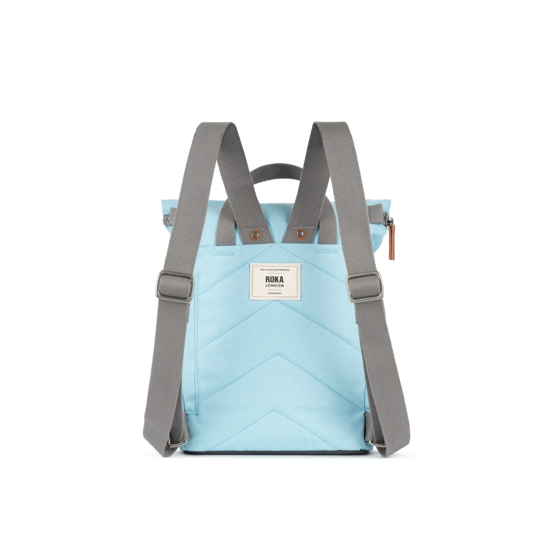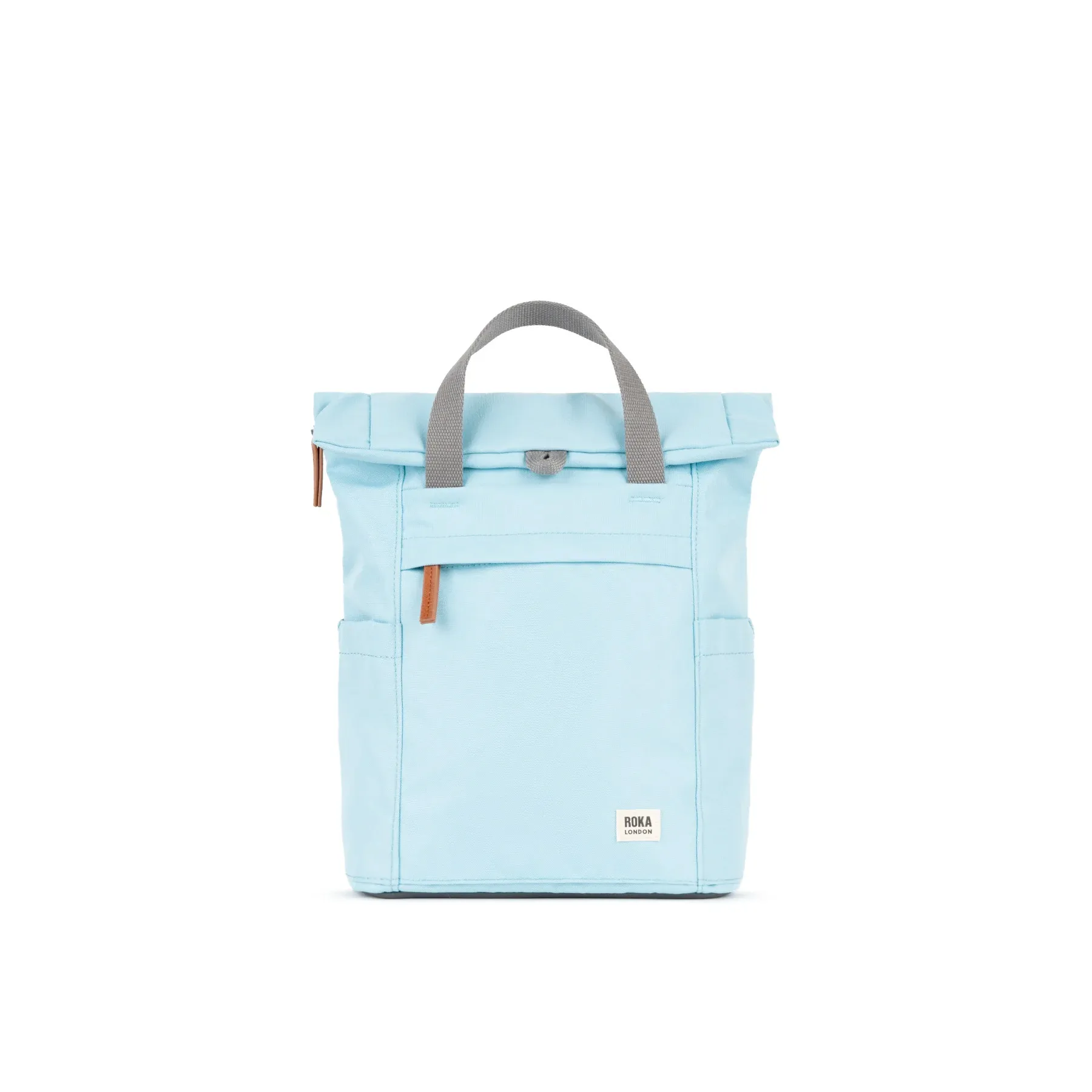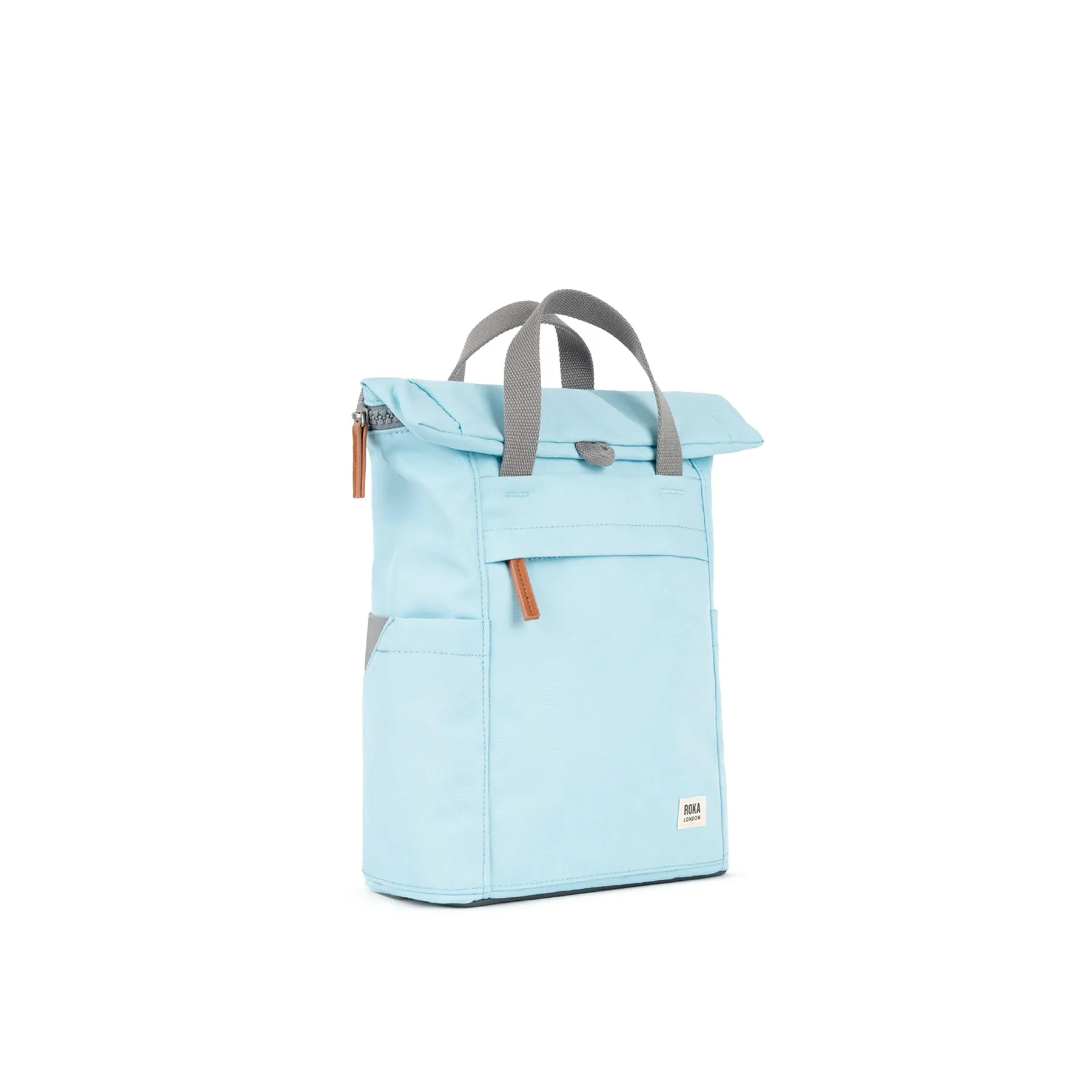 Roka London Finchley A small. In the cool shade of ice blue this backpack is a great little daily bag ideal for those trips where you need to keep you hands free but still need to carry a few essentials like your laptop and other tech gear. Made from a canvas style recycled weather resistant fabric and finished with grey straps, zips and carry handles.