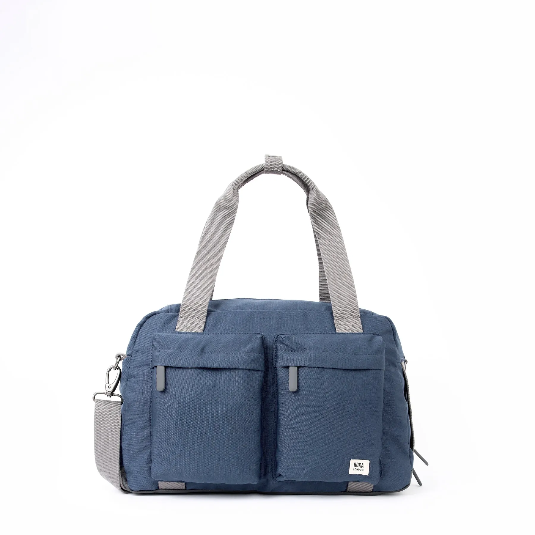 Roka London Gatwick carry-on duffel bag in deep blue recycled canvas material. The versatile bag is packed with features from the handy three internal zip closing pockets, outer pocket for a tablet or ipad, central zip closing compartment with the ability to add a padlock to the zips, three other external storage pockets, a fully removable and adjustable shoulder strap and strong carry handles, this compact bag is everything you need in a small travel bag.