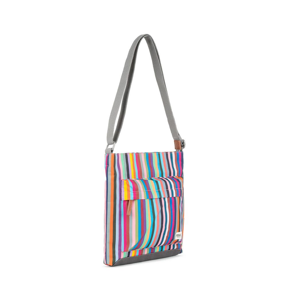 Roka London multi strip canvas Kennington B messenger bag. A classic square across body bag with zip closing top and adjustable strap in contrasting grey. Lined with external pocket. Made using recycled plastic.
