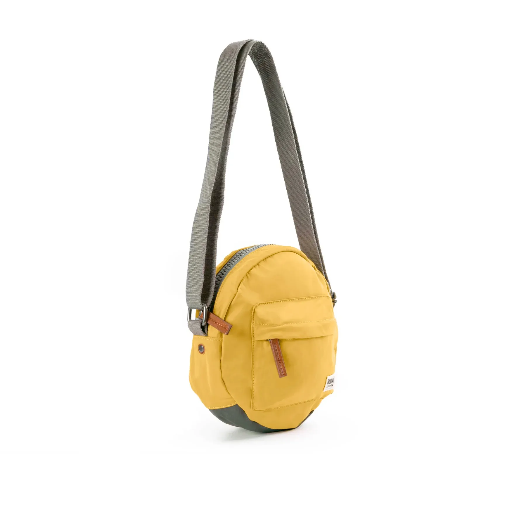 Roka London Paddington B small round cross body bag finished in a corn yellow recycled nylon style fabric. Zip closing top and extra outer pocket with adjustable strap.