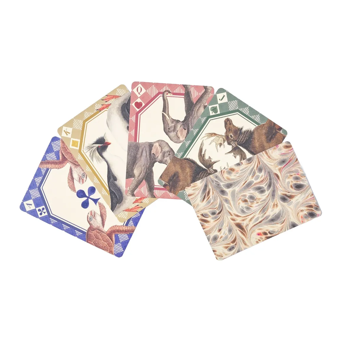 Roomytown animal kingdom playing cards. A single deck of 52 cards with four different antique animal designs, one design for each suit and all finished with a marbled paper print back. Supplied in an attractive pull out card sleeve and includes two joker cards.