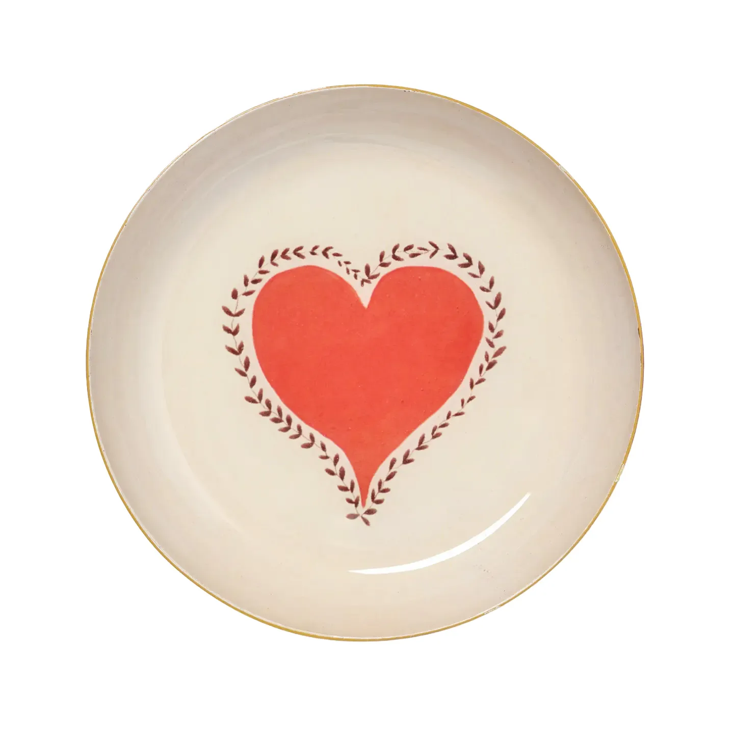 Roomytown heart round enamel tray. A small dish with an illustration of a pale red heart surrounded by a wreath on cream background. The reverse finished as polished brass.