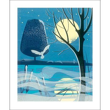 Sally Elford moonlight hares greetings card. A lovely night time countryside scene with hares on a distant river bank and an owl in flight all under a full moon.