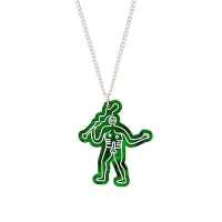 Tatty Devine Cerne Abbas giant pendant necklace. Shaped green acrylic laser etched with the design of this familiar Dorset hillside landmark which has been hand inked in white. Suspended from a silver coloured chain which can be worn at 45cm - 50cm. Supplied in branded gift box.