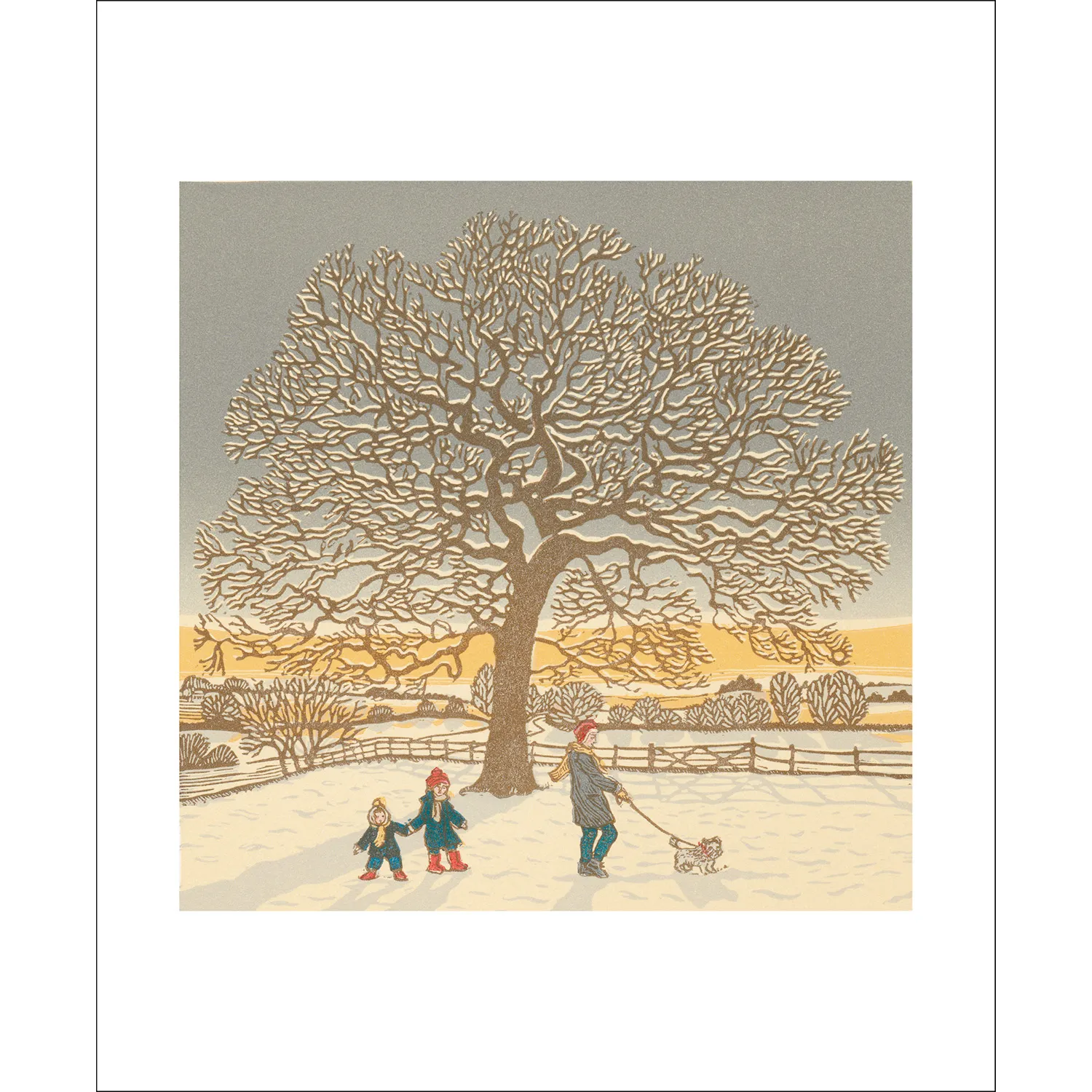 Venessa Lubach winter oak greetings card. A pair of children play under a large tree in a Winter countryside scene. Reproduced from a linocut illustration. Blank inside for your own words.